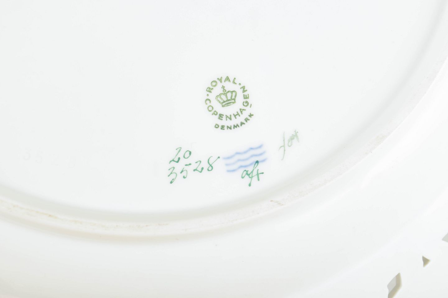 Meget stort Flora Danica-fad med åbent gennembrudt bort, rigt håndmalet med botanisk motiv og forgyldt dekoration.