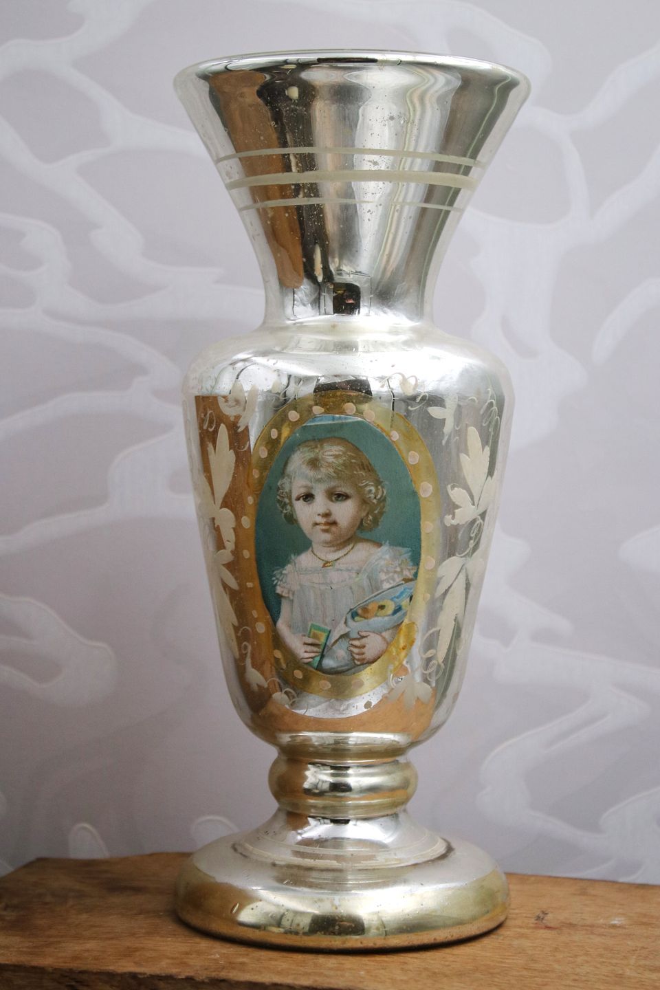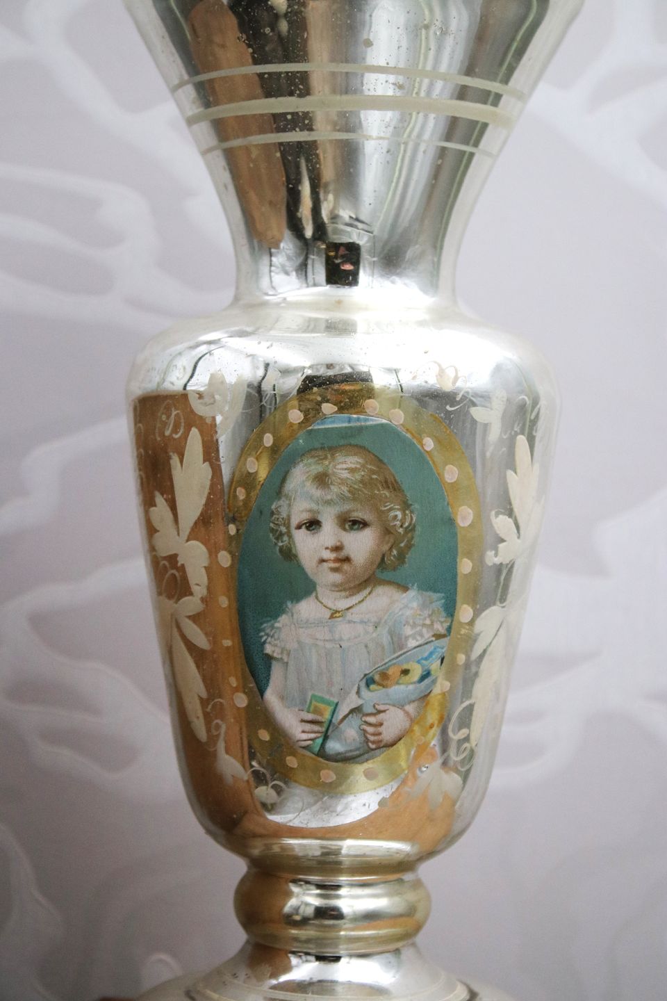 Antik , 1800 tals vase i fattigmandssølv , dekoreret med bemalet blad ranker og håndmalet portræt billede af en lille pige med en slikpose.