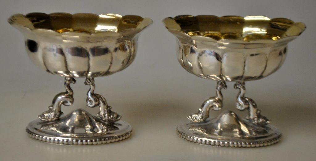Jürgen Joachim Jürgensen (1779–1837), Sønderborg, Dänemark: Paar dänische Rokoko-Salzstreuer aus Silber, 1828. Die Salzstreuer werden von zwei Delfinen gehalten. Innen vergoldet. Gestempelt. Höhe: 6,5 cm. Länge: 8,4 cm.