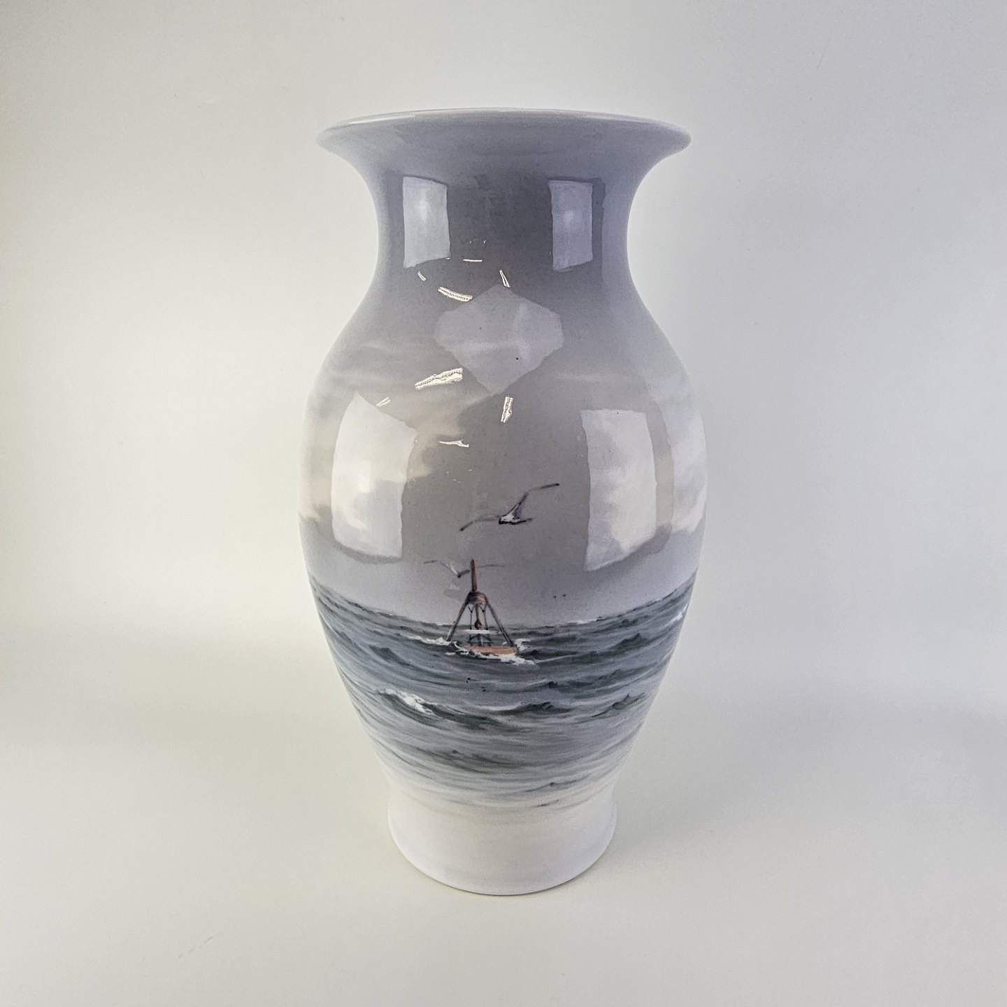 Vase i kongeligt porcelæn med motiv af fiskekuttere til søs