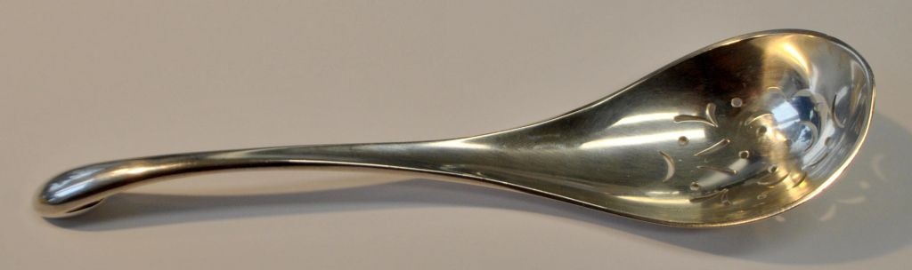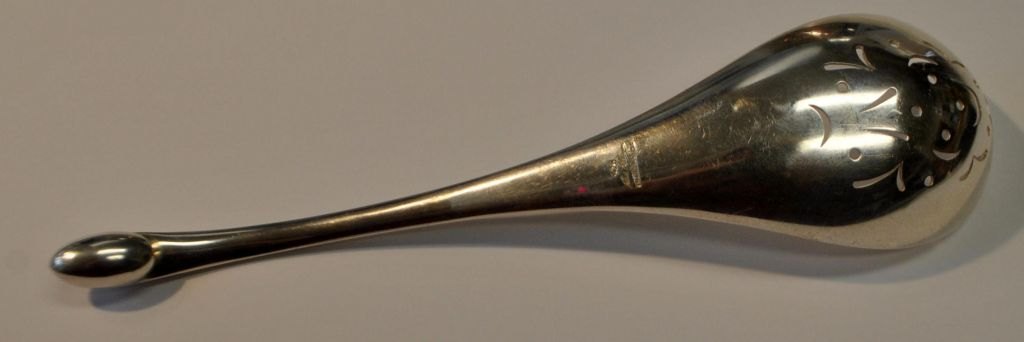 Eislöffel aus Sterlingsilber von Hans Hansen, 20. Jahrhundert. Kolding, Dänemark. Mit Lochverzierungen auf der linken Seite. Gestempelt: Hans Hansen 925 Sterling Denmark. Länge: 17,5 cm. Gewicht: 64 Gramm.