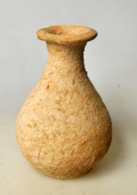 Antikes römisches Parfümfläschchen. Fundstück aus dem Boden. Roter Ton. Höhe: 9,5 cm.