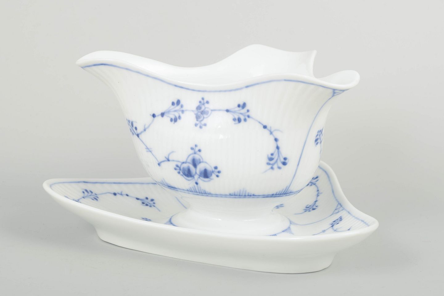 Smuk og klassisk sauceskål i musselmalet porcelæn. Formen er organisk svunget med integreret underfad, dekoreret med håndmalet koboltblåt blomster på riflet korpus.