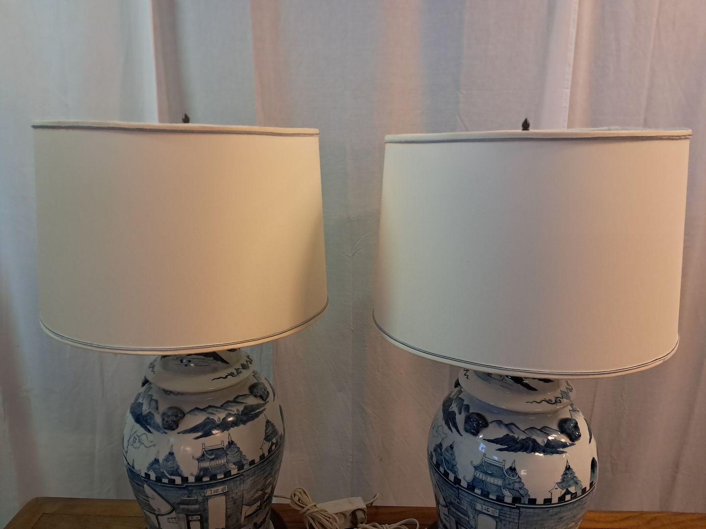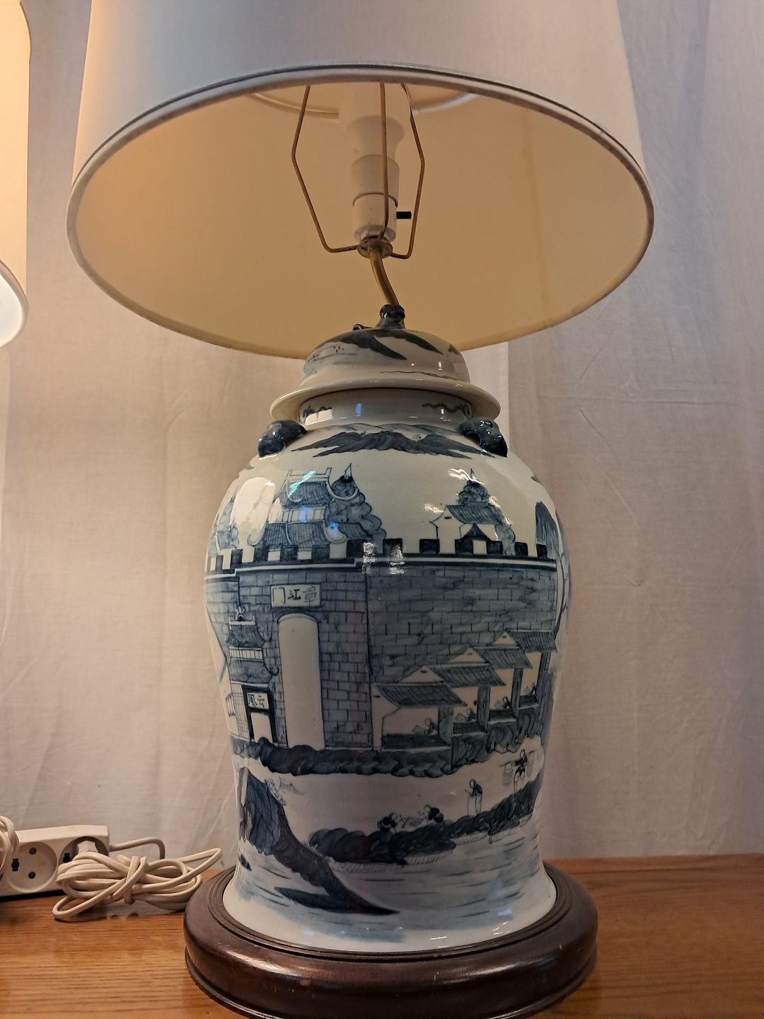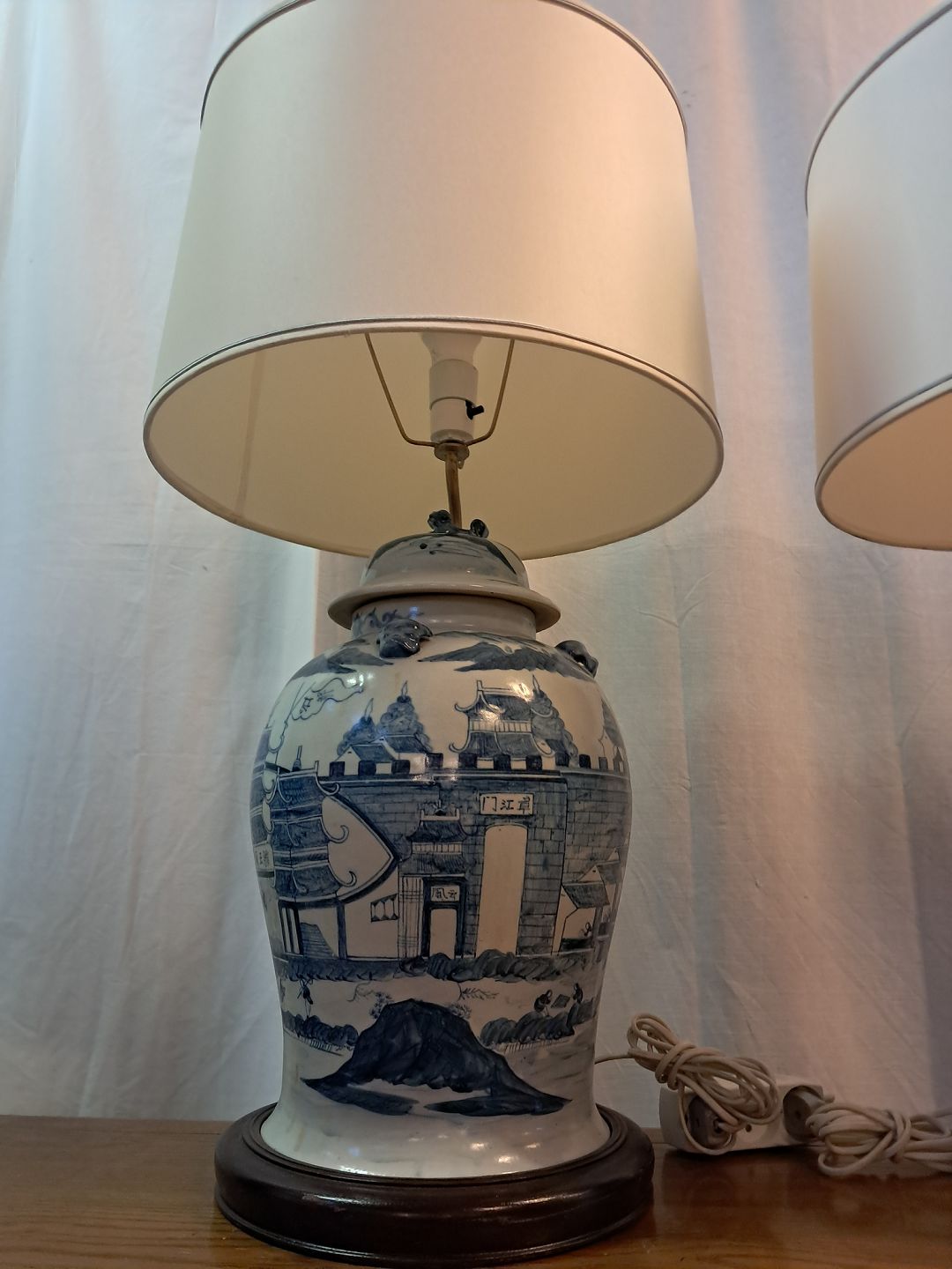 2 Asiatiske bordlamper i pocelæn med skærme, fra 1980erne.