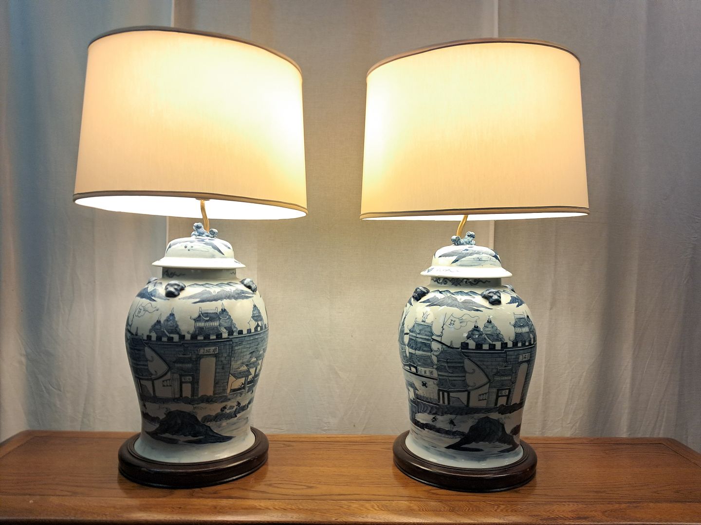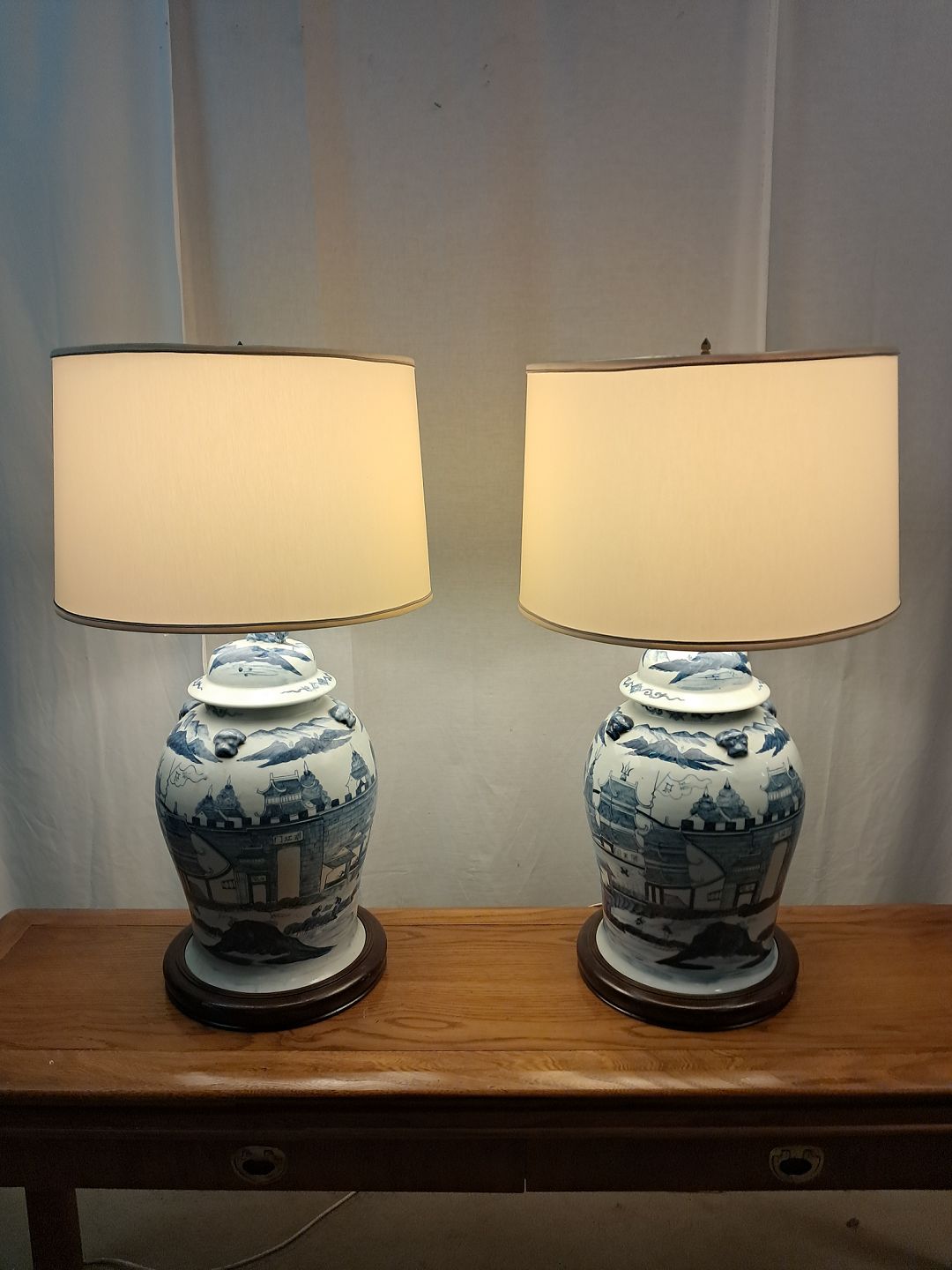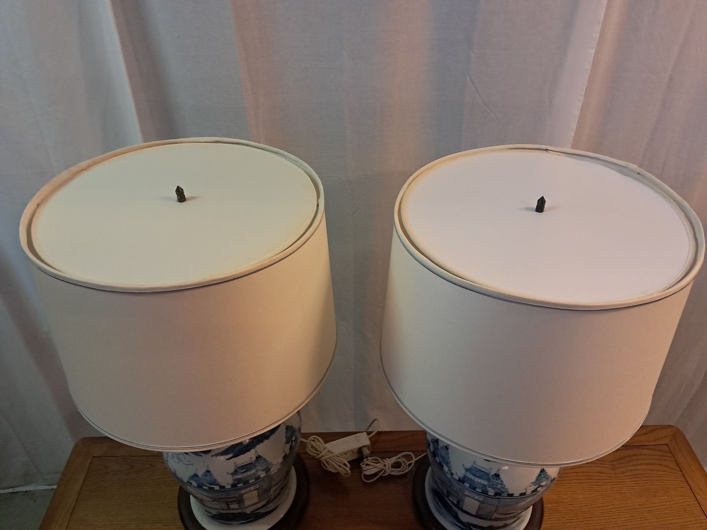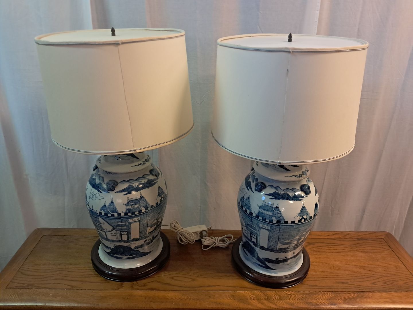 2 Asiatiske bordlamper i pocelæn med skærme, fra 1980erne.