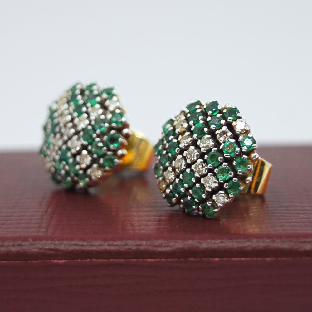 Par runde øreringe i 14kt. guld prydet med diamanter og smaragder