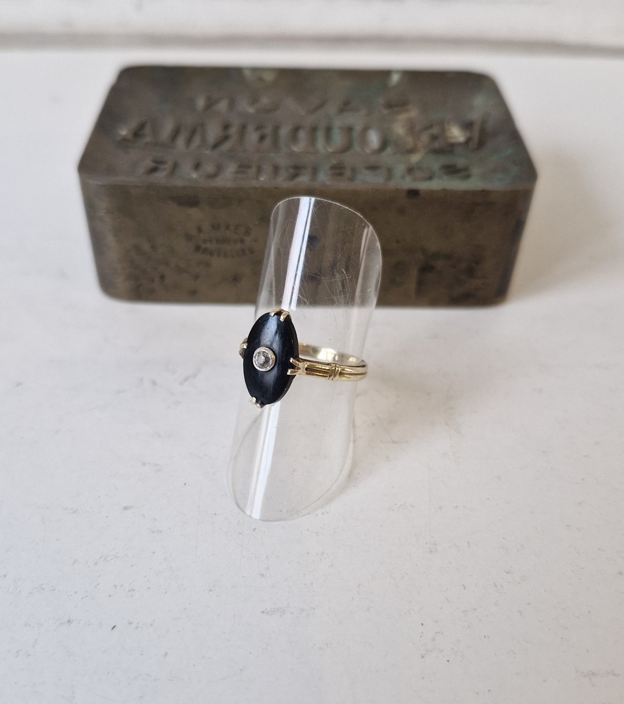Smuk gammel ring i 14 kt. guld med oval onyx prydet med gammel slebet diamant