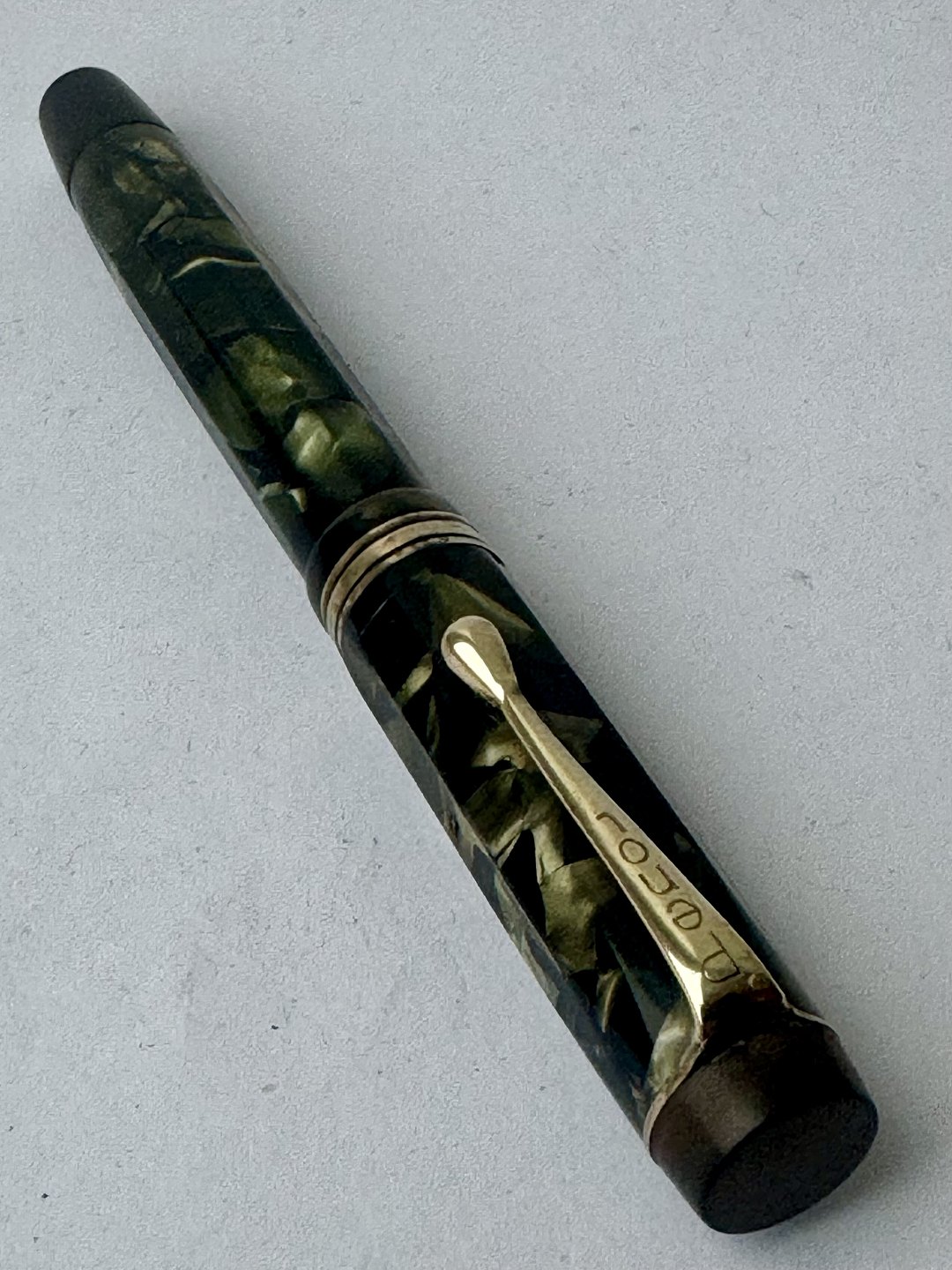 10-kantet og grønt marmoreret Penol 3k fyldepen. Fremstår i god stand med alle originale Penol dele. Inklusiv en 14 karat guldspids. Der skal indsættes ny gummisæk, så pennen igen kan optage blæk og skrive igen. Længde: 13,3 cm.