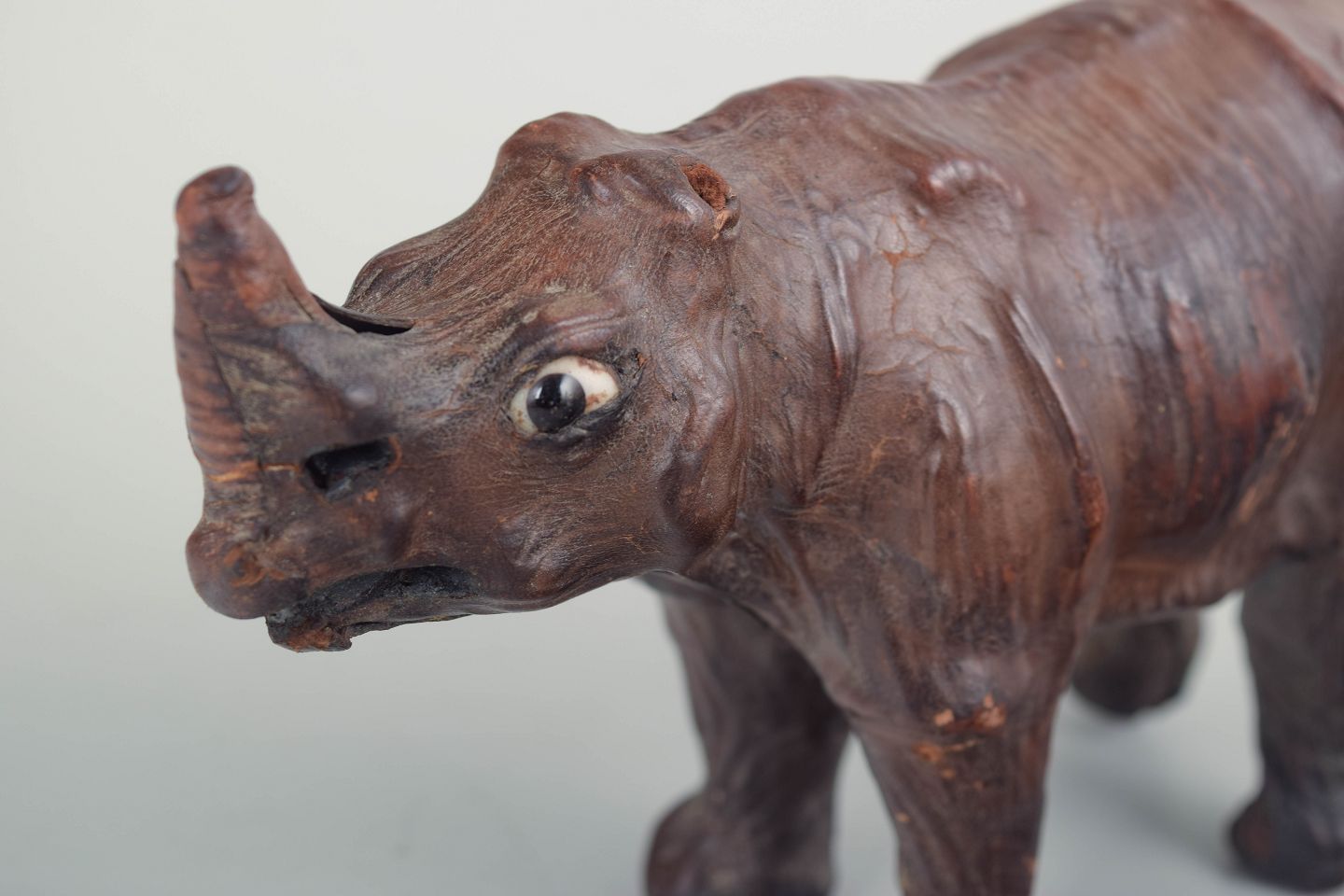 Håndlavet næsehornsfigur udført i formet og syet læder, muligvis forhandlet gennem Liberty & Co., London. Figuren har detaljeret modellerede træk, glasøjne og en mørk patineret overflade, der fremhæver dens håndværksmæssige udtryk.