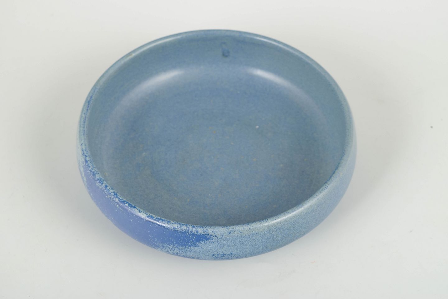 Hånddrejet stentøjsskål i lav, rund form med mat blå glasur i nuancerede toner, typisk for Hjorths eksperimenterende overflader i perioden.