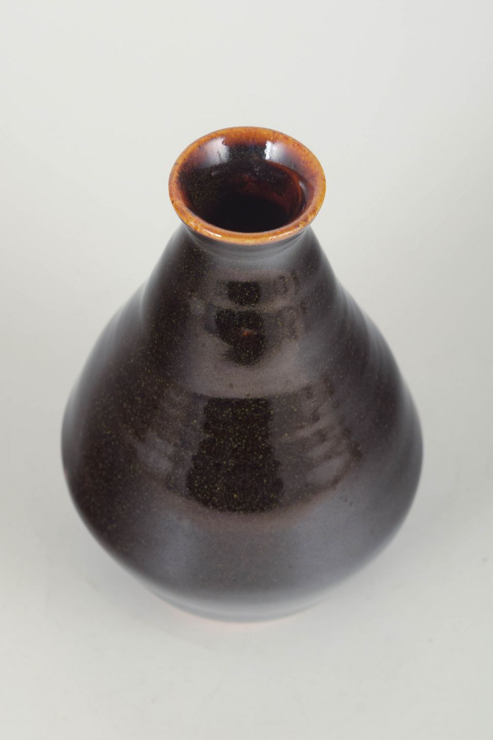 Hånddrejet stentøjsvase med elegant konisk profil, dækket af en dyb, mørk glasur med diskrete spil i overfladen. Et klassisk eksempel på Bornholmsk keramiktradition, hvor håndværk og enkle former går op i en harmonisk helhed.