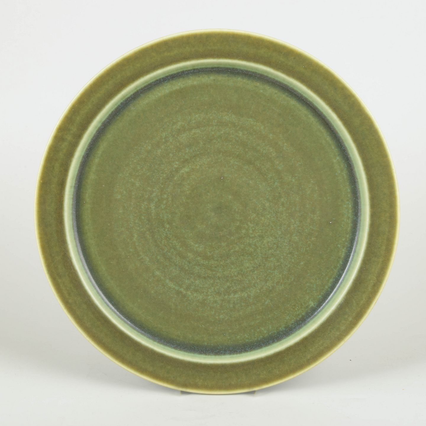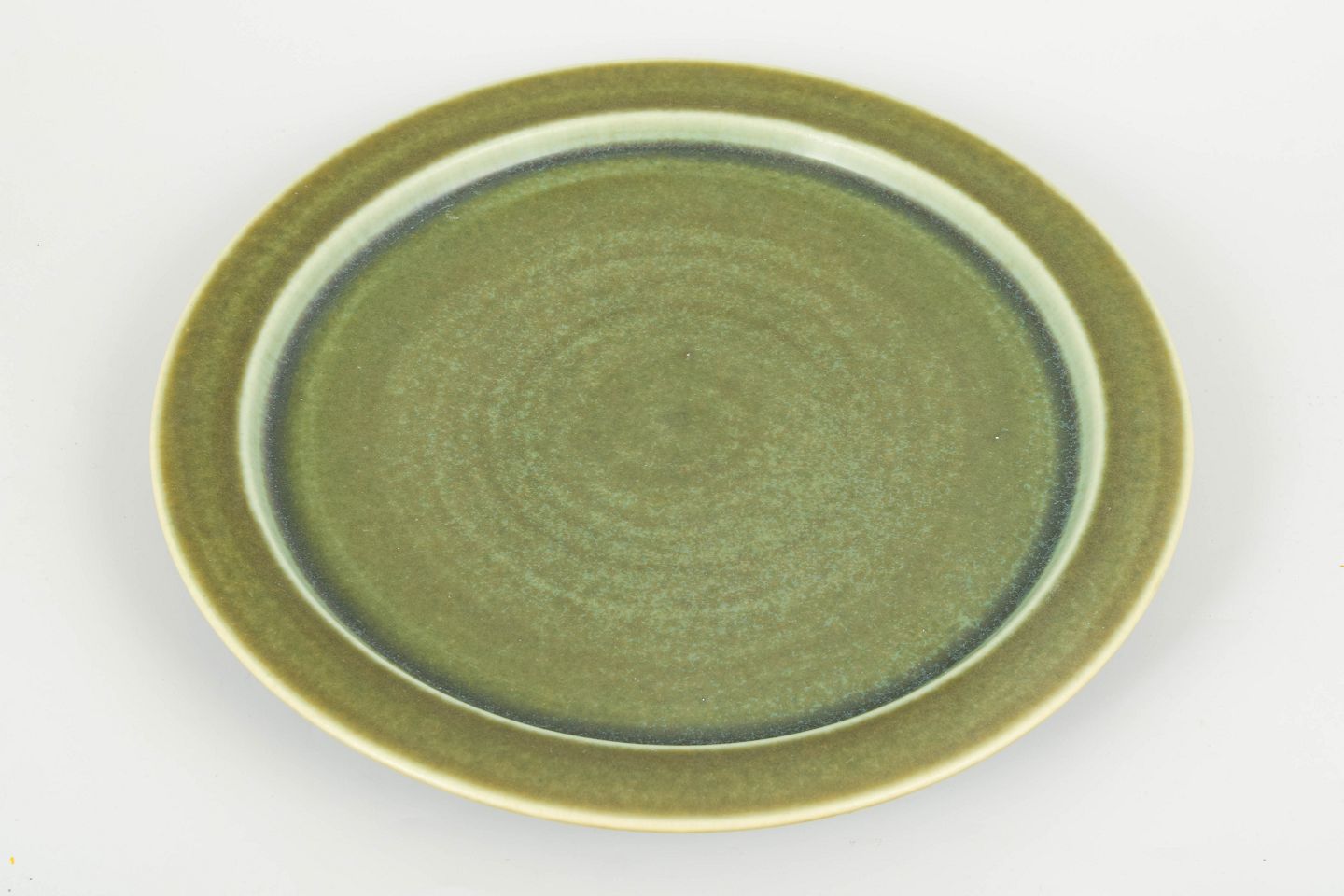 Stort, enkelt formet stentøjsfad i klassisk Saxbo-udtryk med den karakteristiske matte, nuancerede grønne glasur. Formen er rolig og harmonisk, og farvetonen understreger værkstedets modernistiske æstetik. Fadet er i 3. sortering, hvilket afspejles i mindre produktionsrelaterede ujævnheder.
