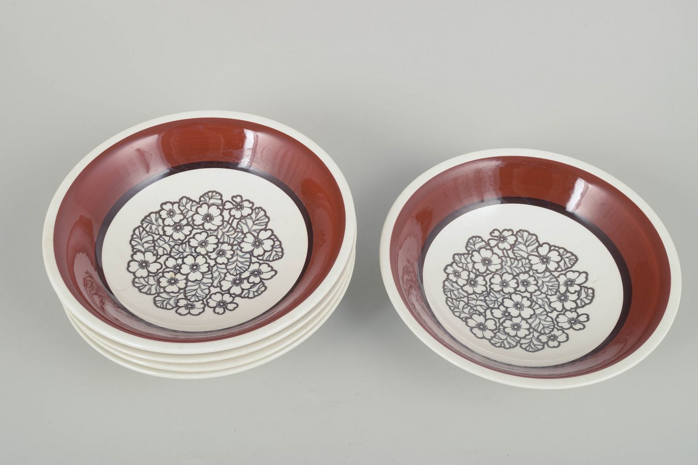 Sæt på 5 dybe stentøjstallerkener med den ikoniske Agneta-dekoration: et grafisk blomsterfelt i sorte linjer, indrammet af den varme rødbrune kant, som kendetegner serien. Velegnet som suppe- eller pastatallerkener.