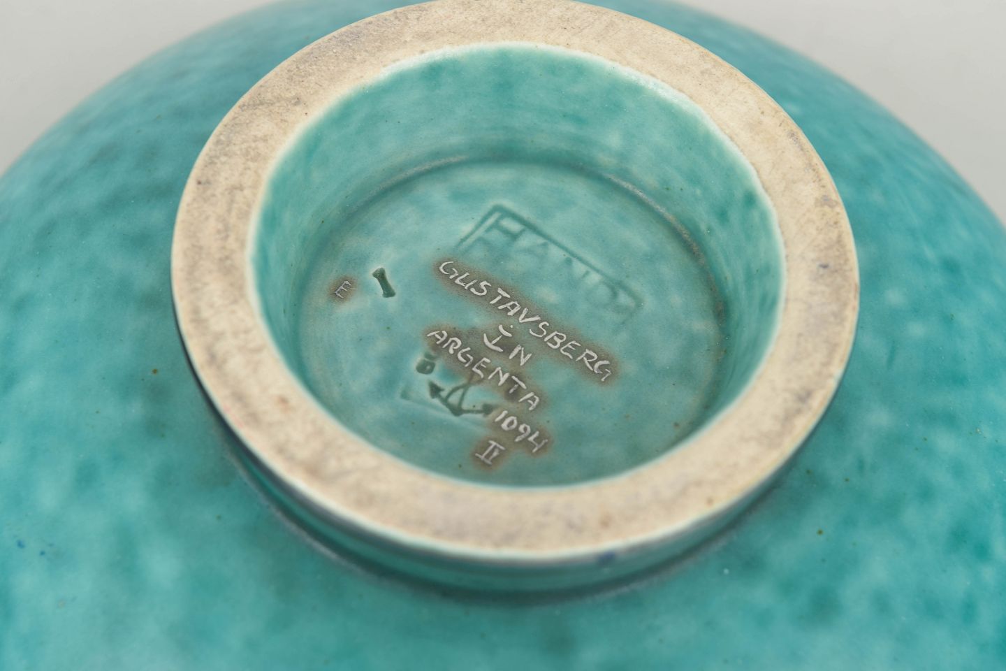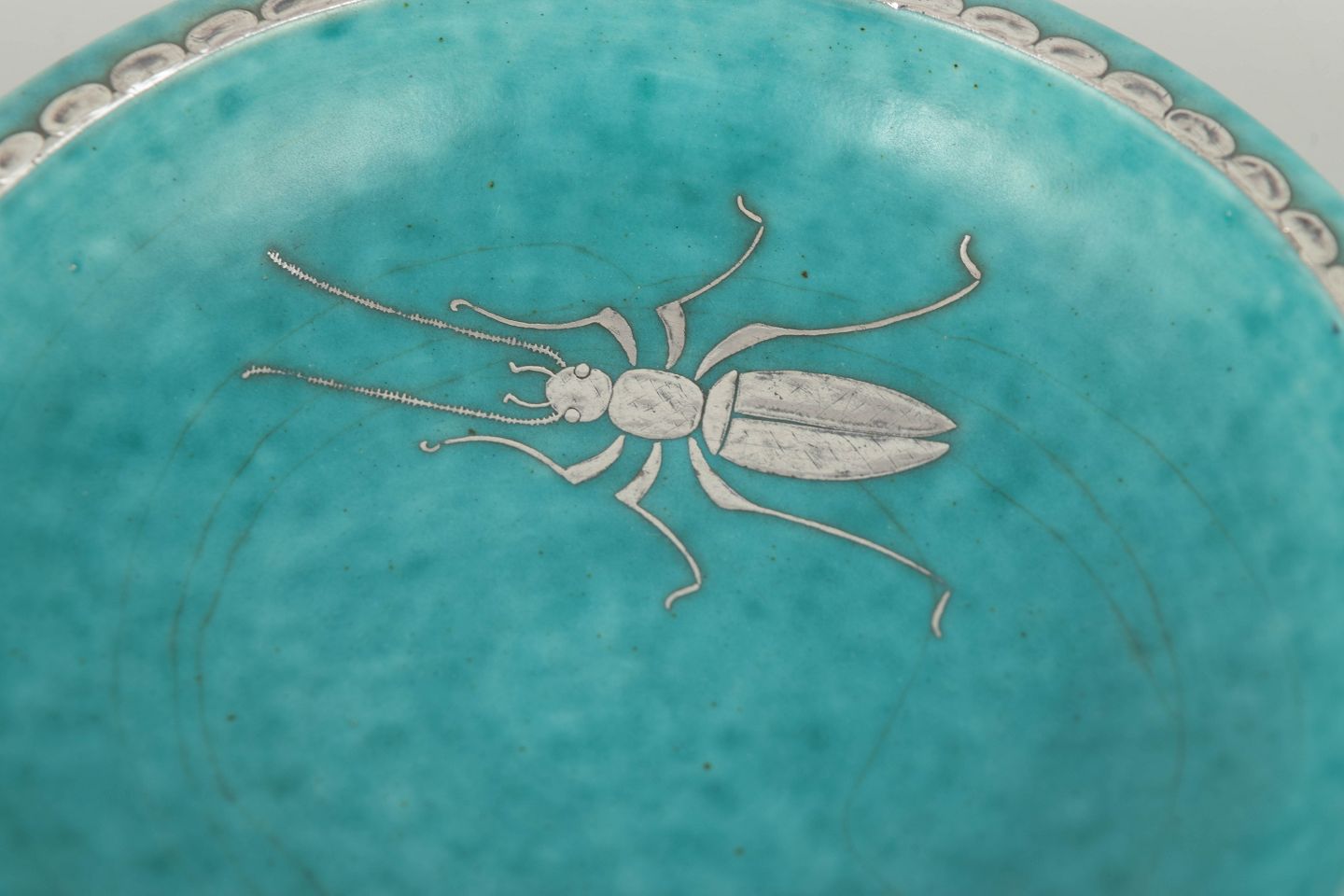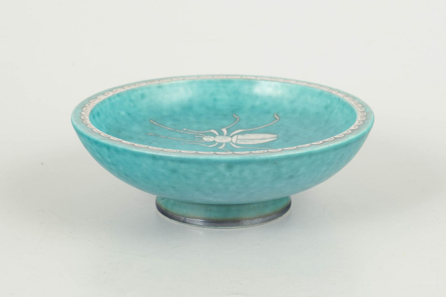Lav, rund skål i den ikoniske turkise Argenta-glasur dekoreret med indlagt sølvmotif. Skålen viser Kåges karakteristiske balance mellem funktionalitet og dekorativt udtryk og står på en lille fod i klassisk form.