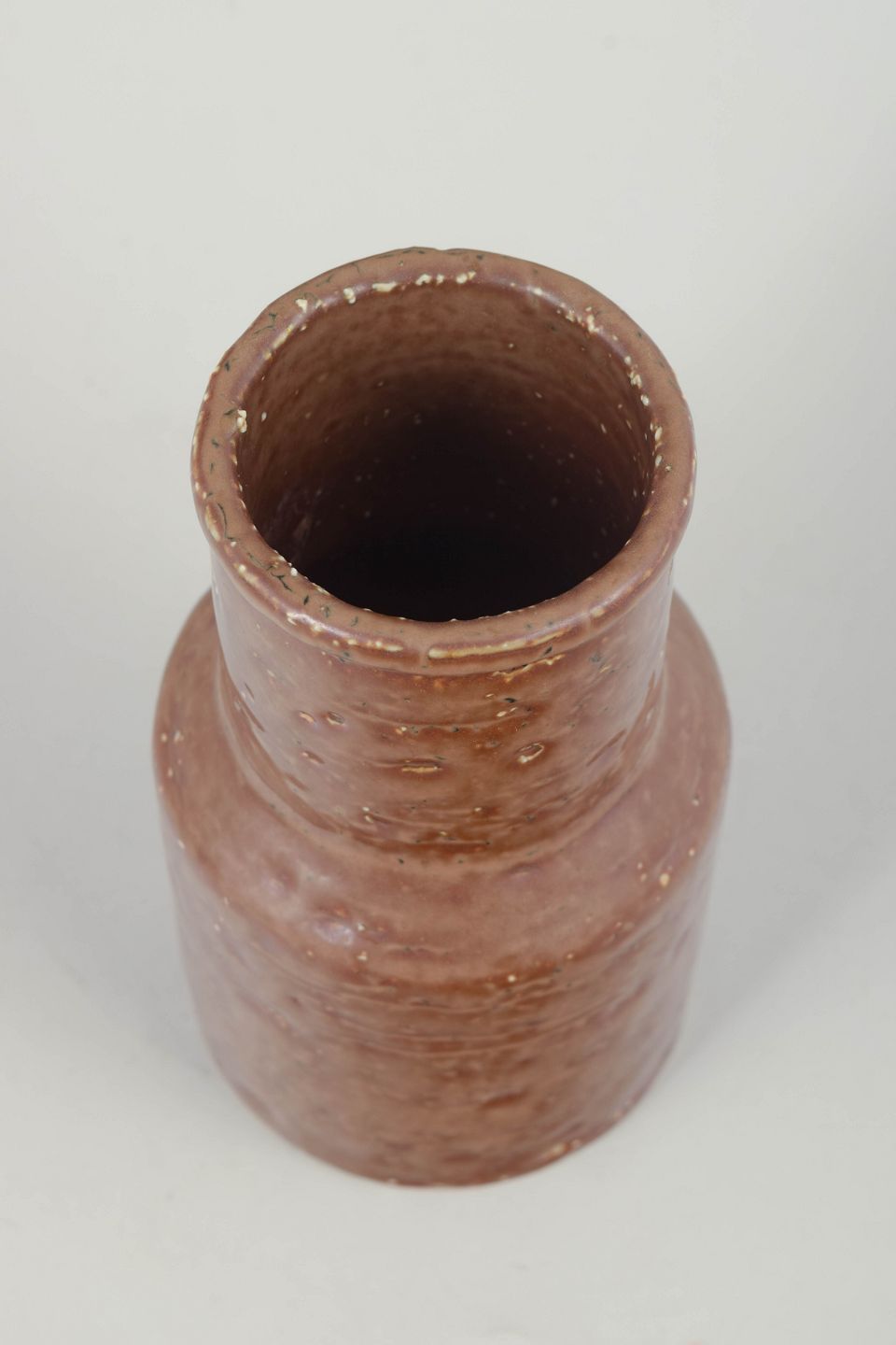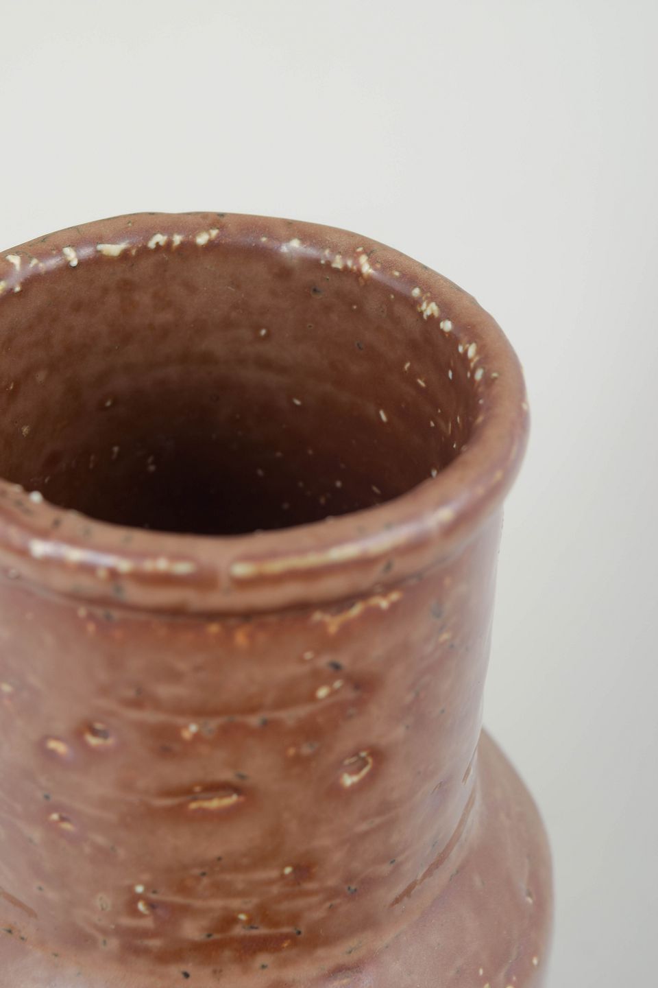 Cylindrisk studiovase i hånddrejet stentøj med brunligt, let nuanceret glasurspil og subtil overfladestruktur. Den enkle, funktionelle form fremhæver materialets naturlige karakter og det tydelige håndværk.