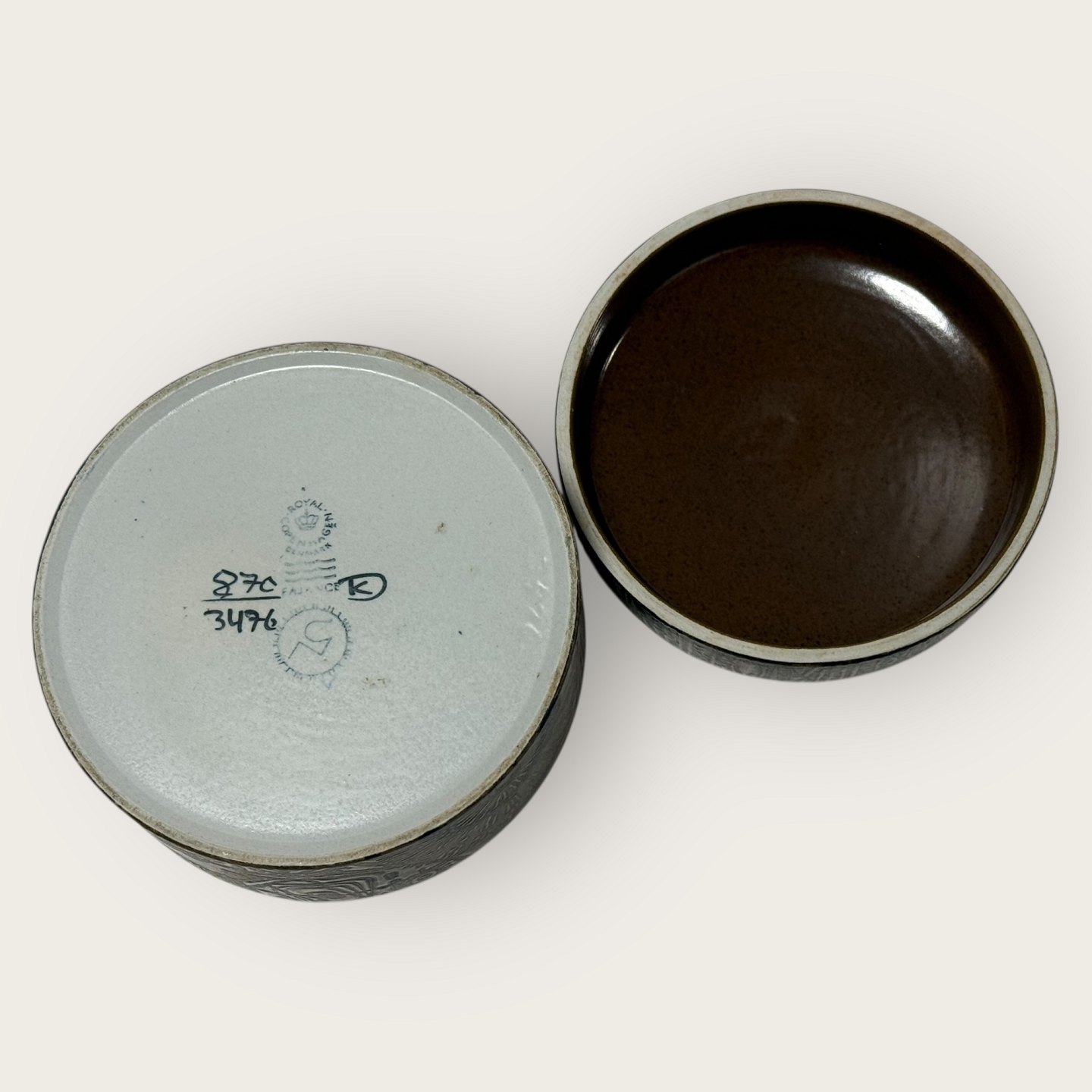 | Royal Copenhagen, Deckelgefäß, Nr. 87C / 3476, Durchmesser 11 cm, Höhe 6,5 cm, Design Nils Thorsson *Exzellenter Zustand*