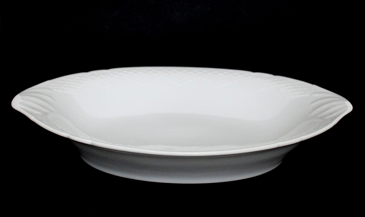 Text zugänglich auf Dänische: Bing & Grøndahl, Elegance, Stort ovalt brødfad meget sjælden og smukt. Nr. 195. Længde 34 cm. Bredde 24,5. Højde 5,5 cm. II. sortering. Enkelte overfladeridser efter brug. Pris: 975 kr.