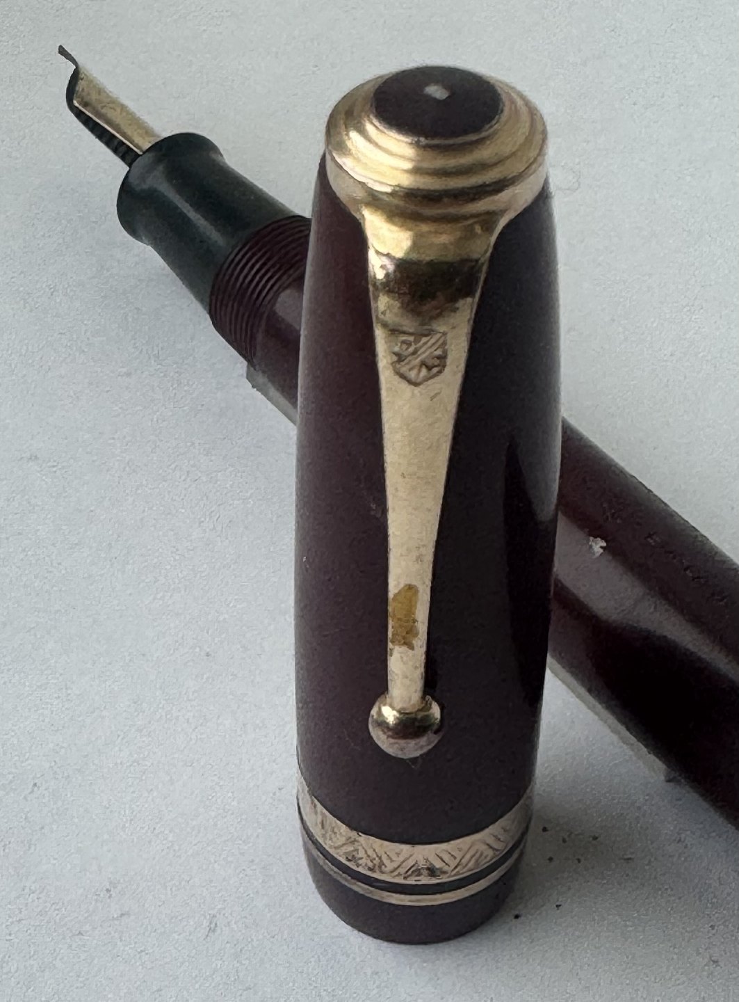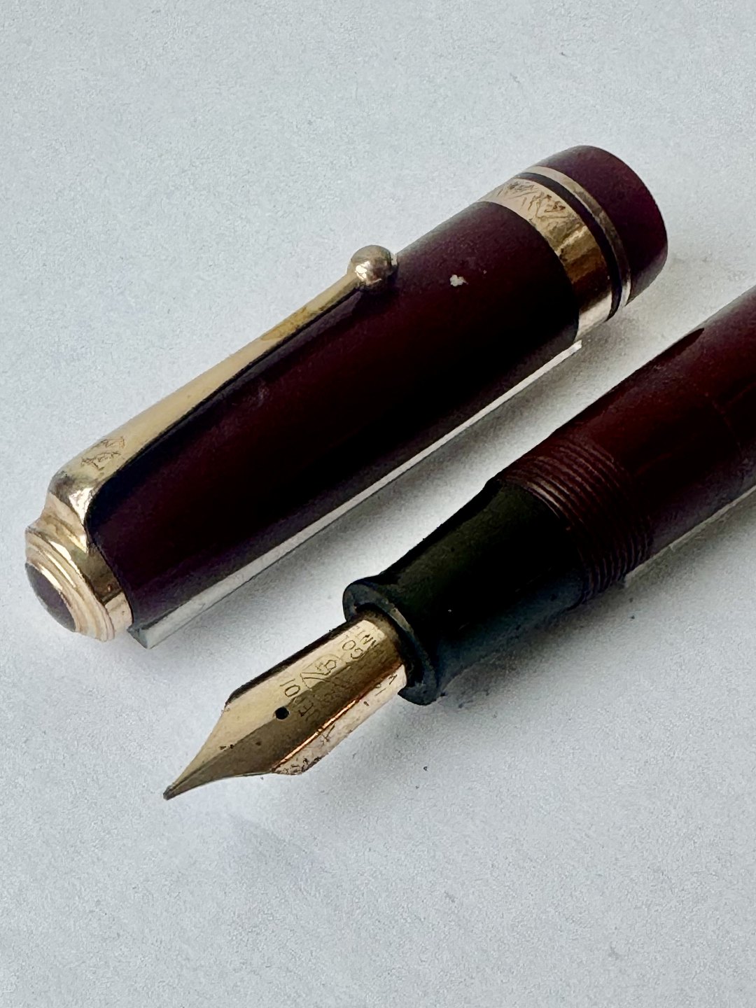 Kraftig Bordeaux “True Point” fountain pen. Push button filler. Fremstillet i England omkring 1950. Fremstår i god stand uden skader eller reparationer. Der skal indsættes en ny gummisæk før end fyldepennen igen skal optage blæk og skrive igen. Dette koster ekstra kr. 200, at få udført. Længde: 13,4 cm