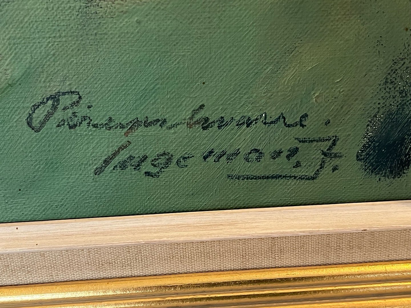 Dette oliemaleri af Finpaavanne Ingeman er indrammet i en elegant guldramme og fremst�r i en abstrakt eller impressionistisk stil med markante penselstr�g og et levende farvevalg. Motivet synes at afbilde en gr�n, kuperet kystlinje, der m�der vandet under en himmel i hvide og bl� nuancer. I nederste venstre hj�rne forekommer en signatur, som dog er vanskelig at tyde.Fotografiet er taget indend�rs, hvor maleriet er placeret op ad en v�g; en vaskemaskine og en taske er synlige i forgrunden. V�rket er i s�rdeles flot stand uden synlige fejl.M�l: 114 � 85 cmLevering kan arrangeres.