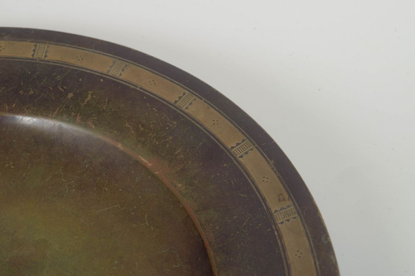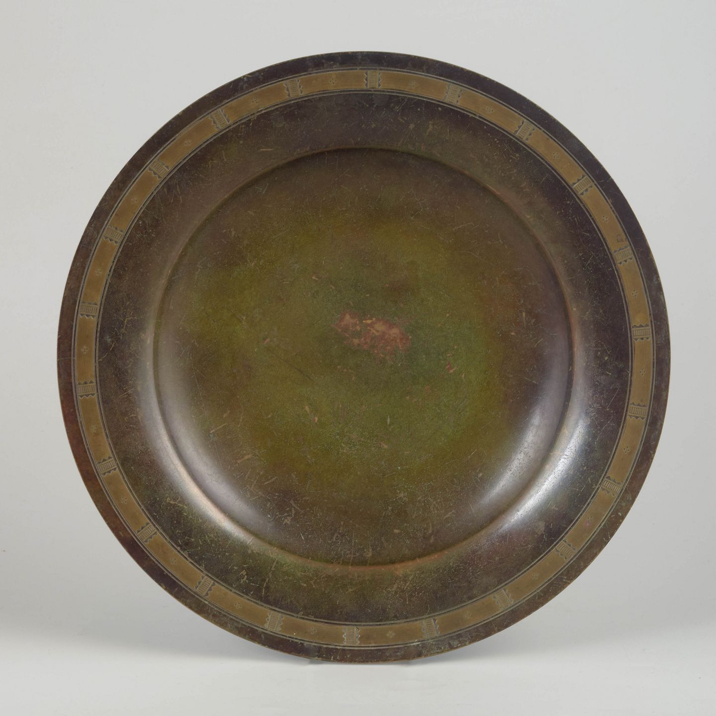 Stort rundt art deco fad med bred kant dekoreret med indlagte geometriske bånd. Den varme grønbrune patina og de stramme linjer er karakteristiske for Just Andersens formsprog og hans arbejde med egne legeringer.