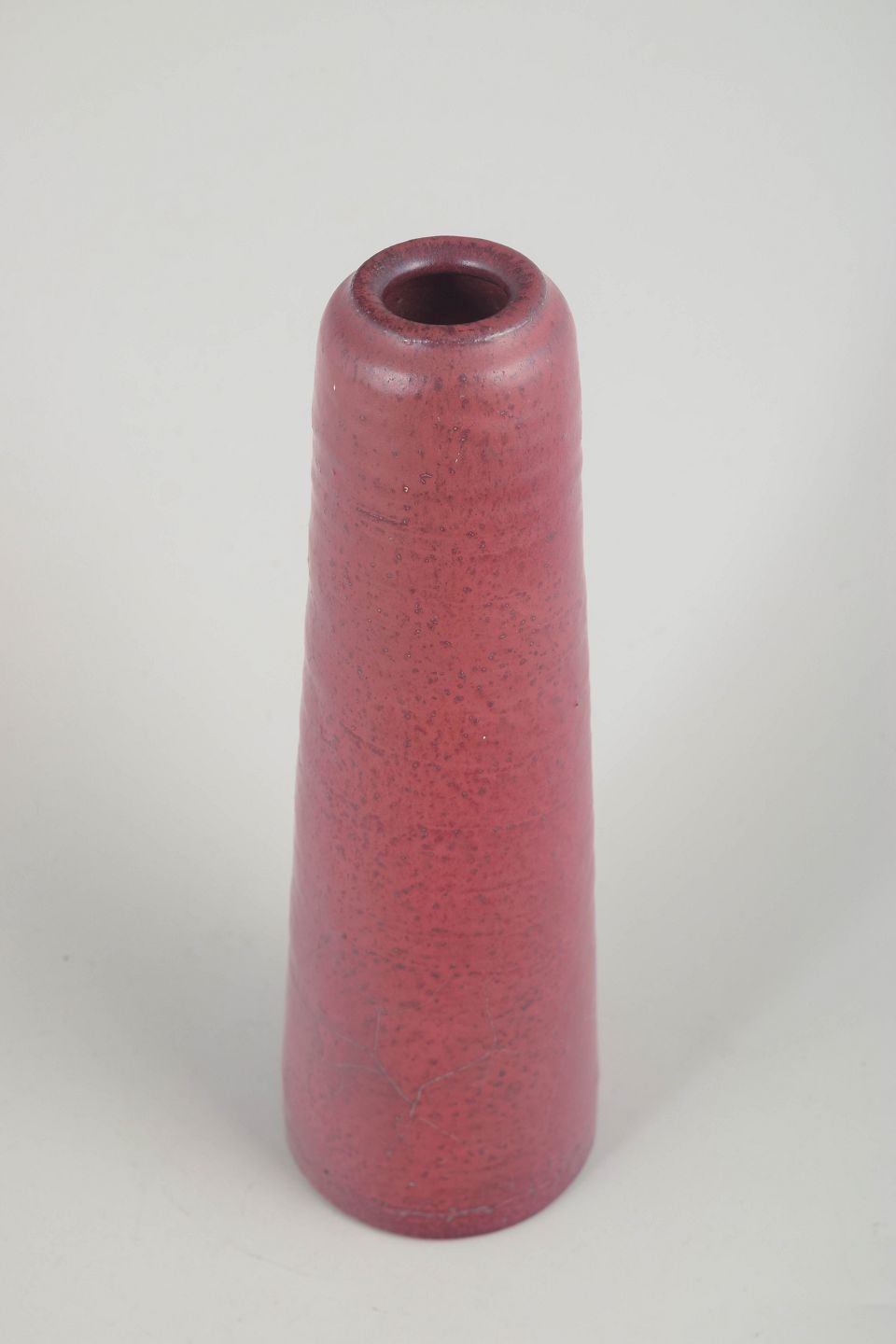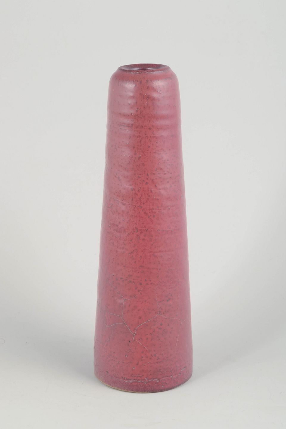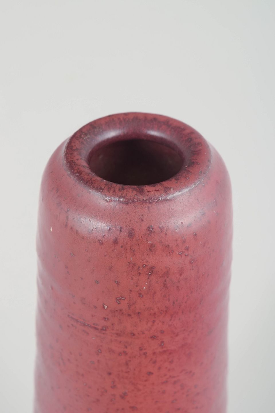 Stor, håndglaseret vase i klassisk Mobach-udtryk med cylindrisk, let konisk form og dyb rød glasur med levende overfladespil. Et markant og dekorativt stykke fra værkstedets 1970’er-produktion.