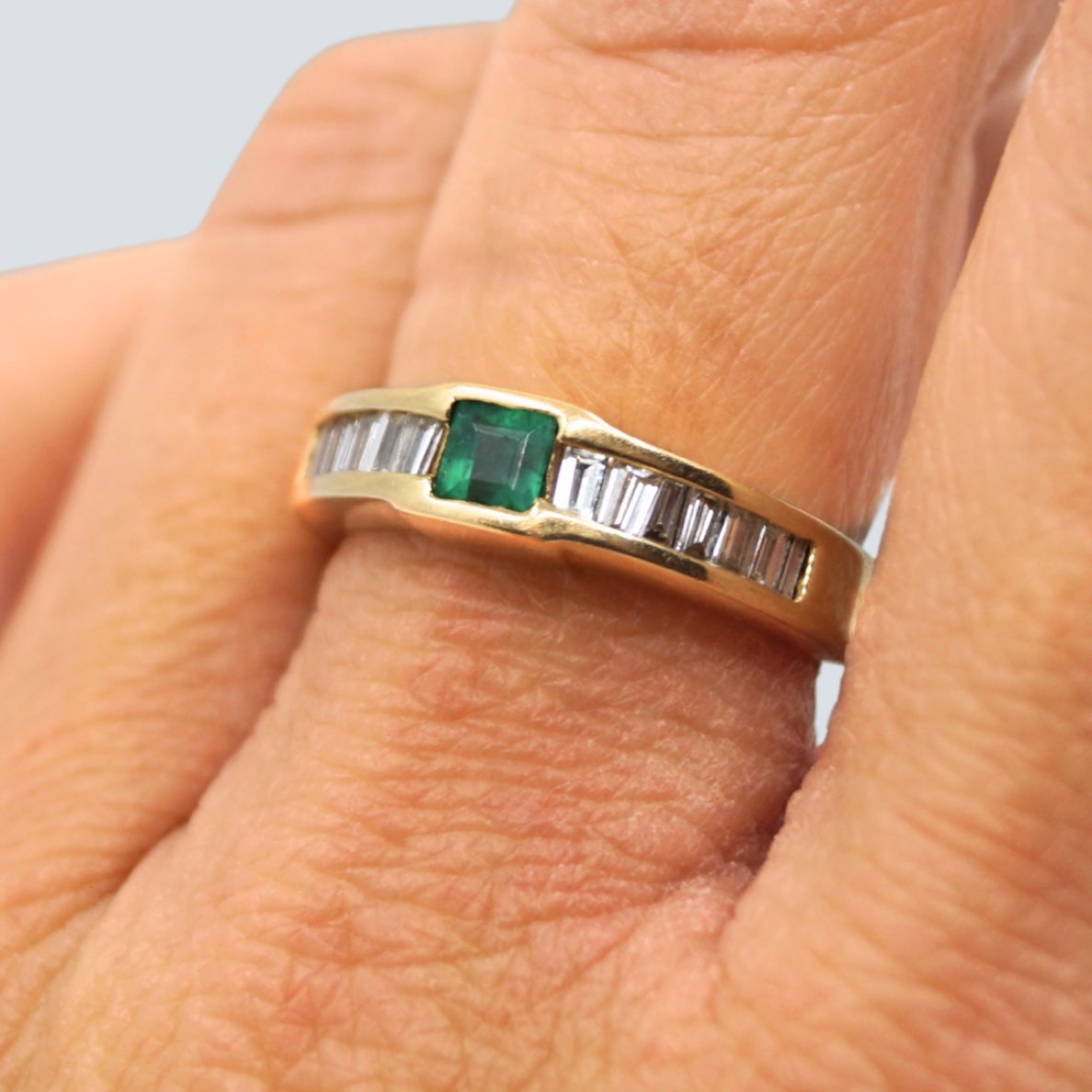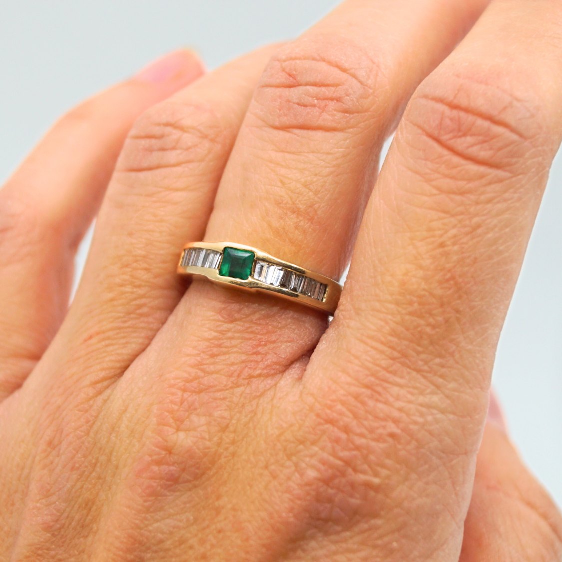 Text zugänglich auf Dänische: Ring i 18 kt. guld, prydet med smaragd og diamanter, i alt 0.40 ct. Top Wesselton VS. Ring str. 51,5.