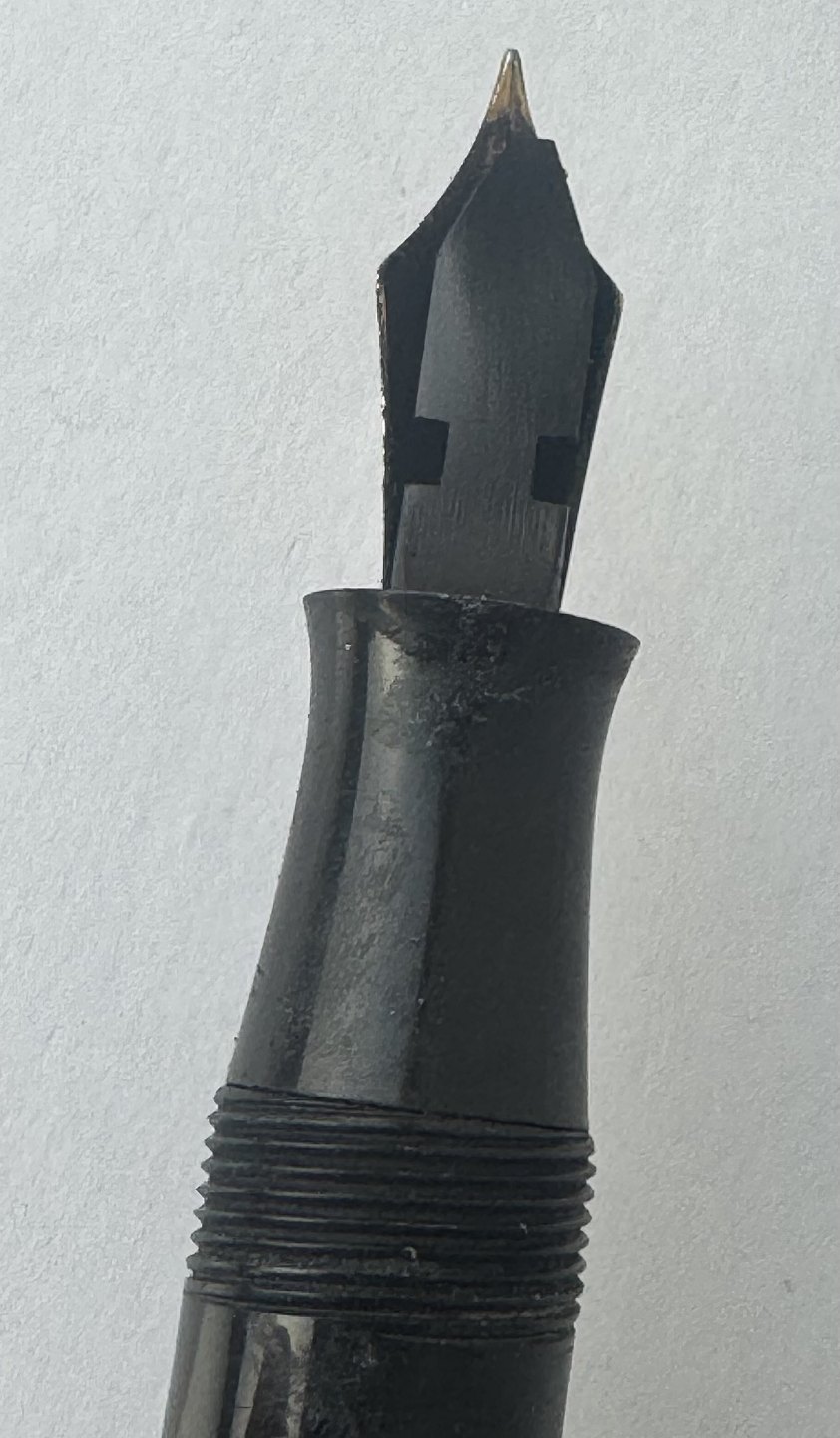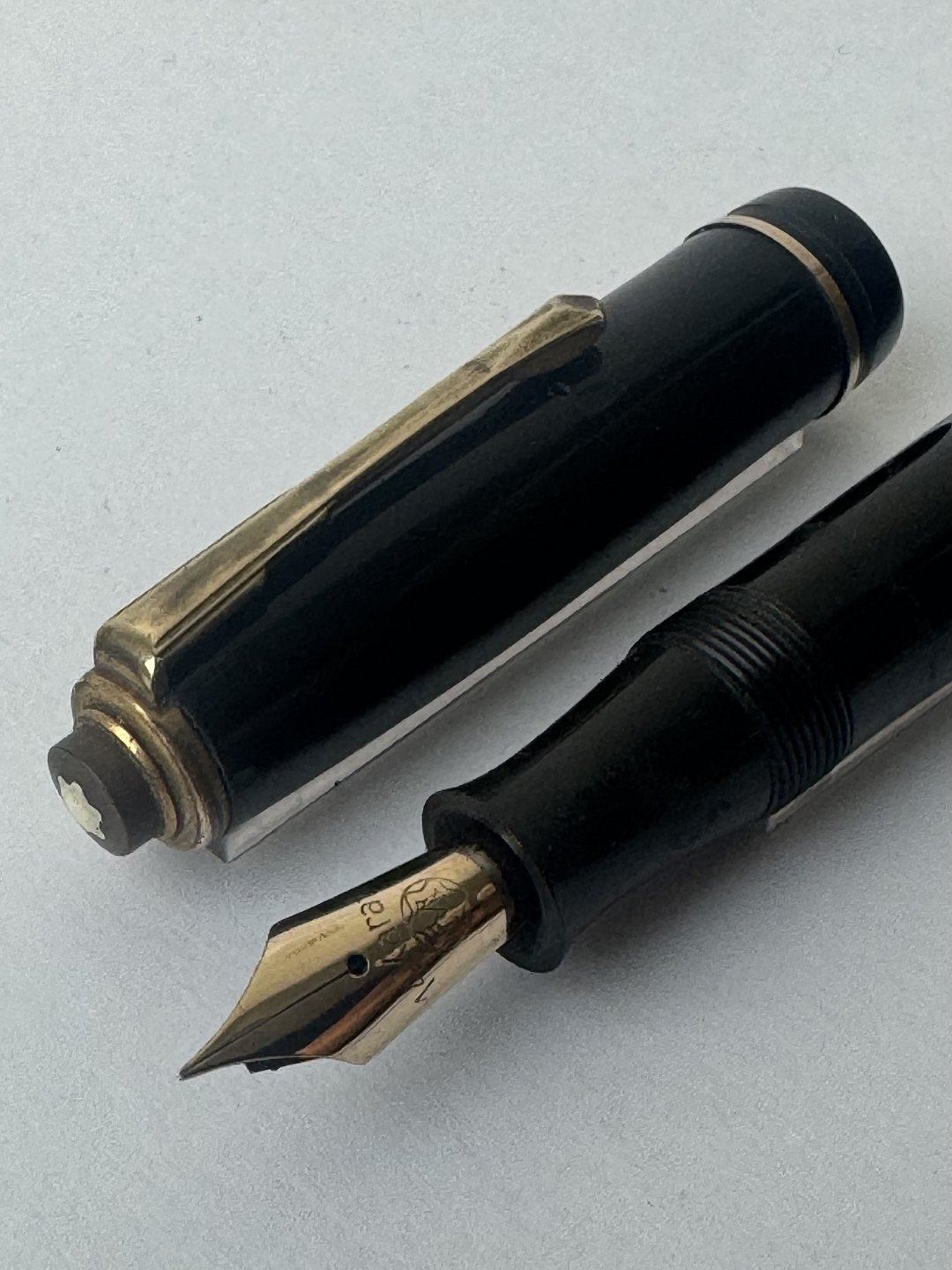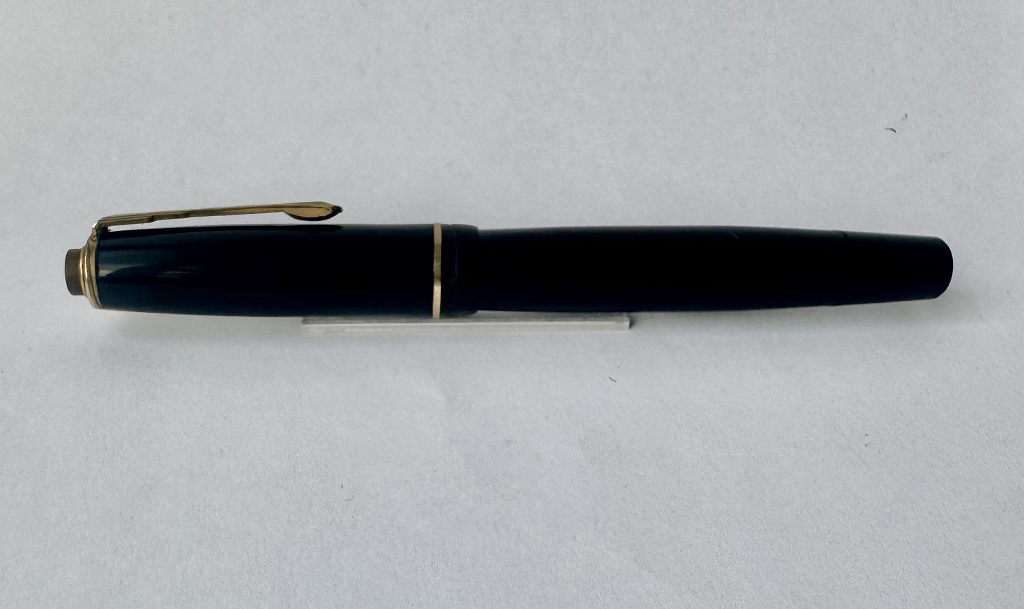 Sort Montblanc no. 226 fyldepen. Fremstillet i Danmark fra slutningen af 1940’erne. Mangler et mavebælte på hætten. Ellers i god stand uden skader eller reparationer. Hætten mærket med MONTBLANC den lille sorte bundskrue med modelnummeret 226. Der skal indsættes en ny gummisæk, før end den igen kan optage blæk og skrive påny.