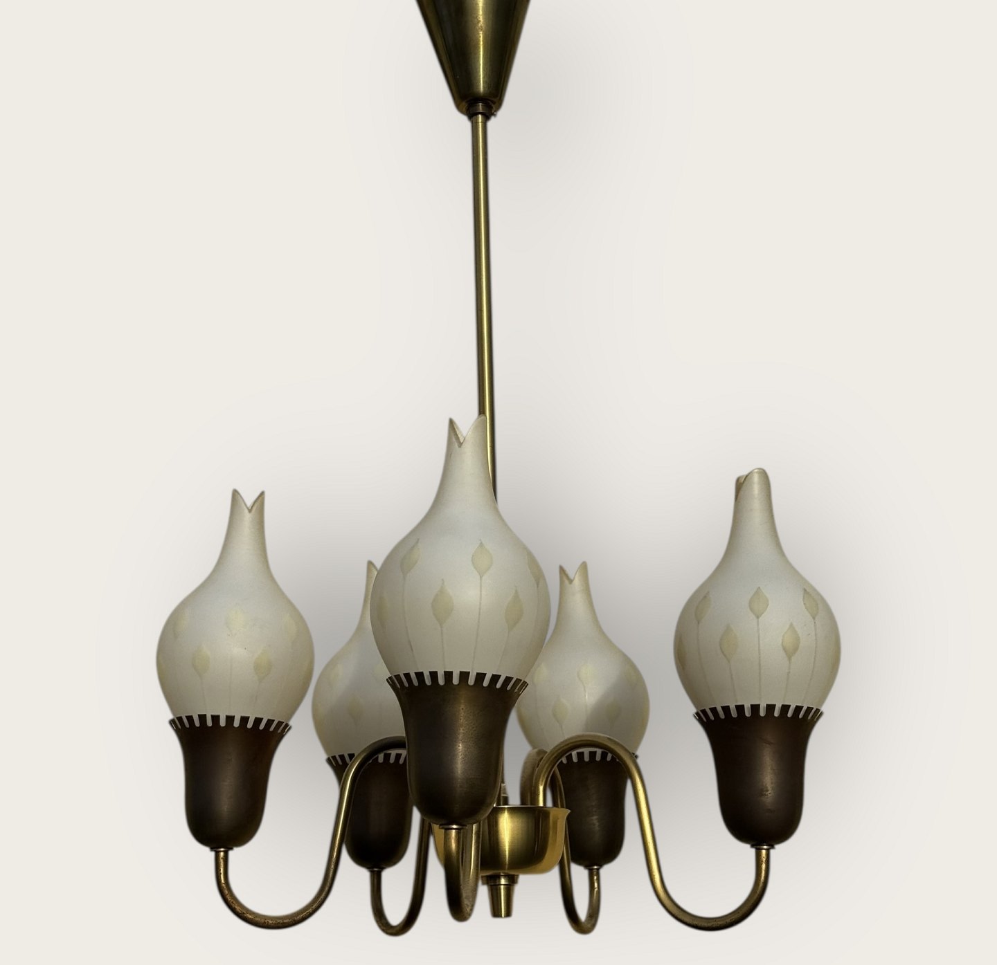 Kronleuchter aus Messing mit Glasschirmen, 5 große, tulpenförmige Schirme, vermutlich von Fog & Mørup gefertigt, jeder Schirm ca. 20 cm hoch und 10 cm im Durchmesser, die Lampe selbst 42 cm im Durchmesser und 67 cm hoch. *Hervorragender Zustand*
