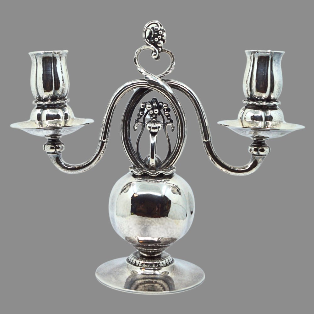 Text zugänglich auf Dänische: Georg Jensen; Massiv to armet kandelaber i hamret sterling sølv, prydet med druer og granatæble. Designet af Georg Jensen omkring 1914-1918. Dessin nr. 324.
