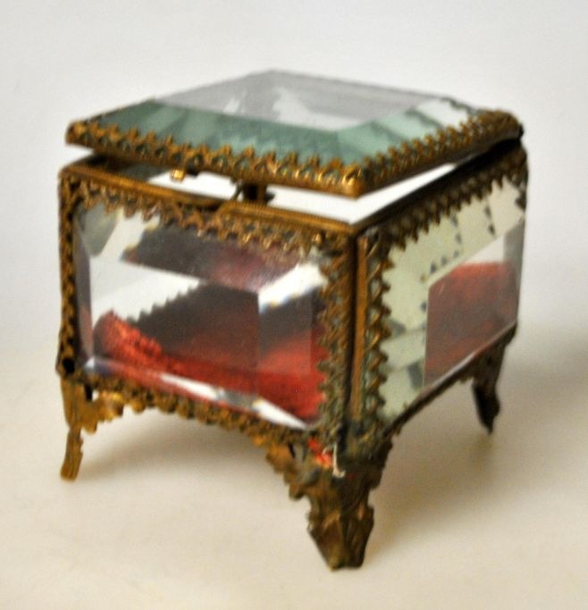 Schmuckkästchen, um 1900. Frankreich. Mit facettiertem Glas, verziertem Messingrahmen und vier Füßen. 6,5 x 6 x 6,5 cm.
