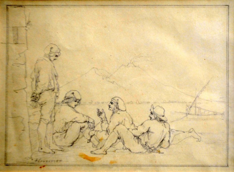 Conradsen, Harald (1817–1905) Dänemark: Italienische Fischer im Gespräch am Kai, im Hintergrund der Vesuv. Signiert. 16 x 22,5 cm.