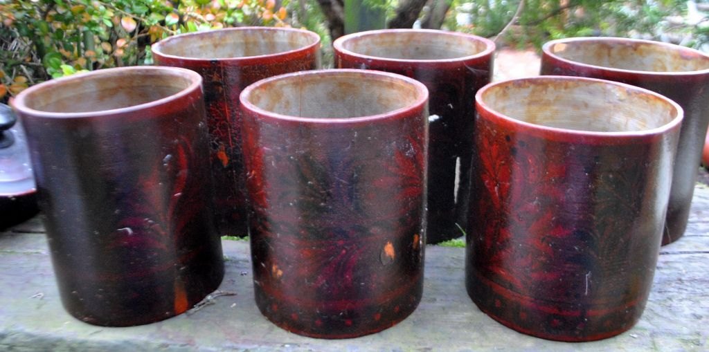 Sammlung russischer Holzkästchen aus dem 19. Jahrhundert. Gedrechseltes und ausgehöhltes Holz. Außen bemalt und lackiert. Innen silberfarben. Insgesamt 5 Stück. Hinweis: Nur als Set erhältlich!