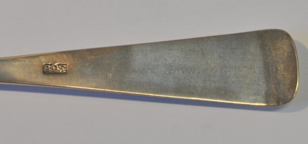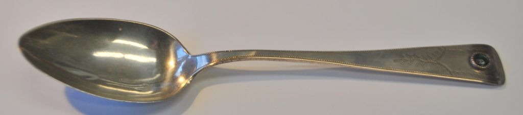 Peter Johannesen Petersen (1805–1873), Aabenraa, Dänemark: Silberlöffel mit grünen Glaseinschlüssen. Gestempelt. Länge: 23 cm. Mit Gravuren am Griff. Gravur: J. Jepsen, Eken den 9.9.1897.