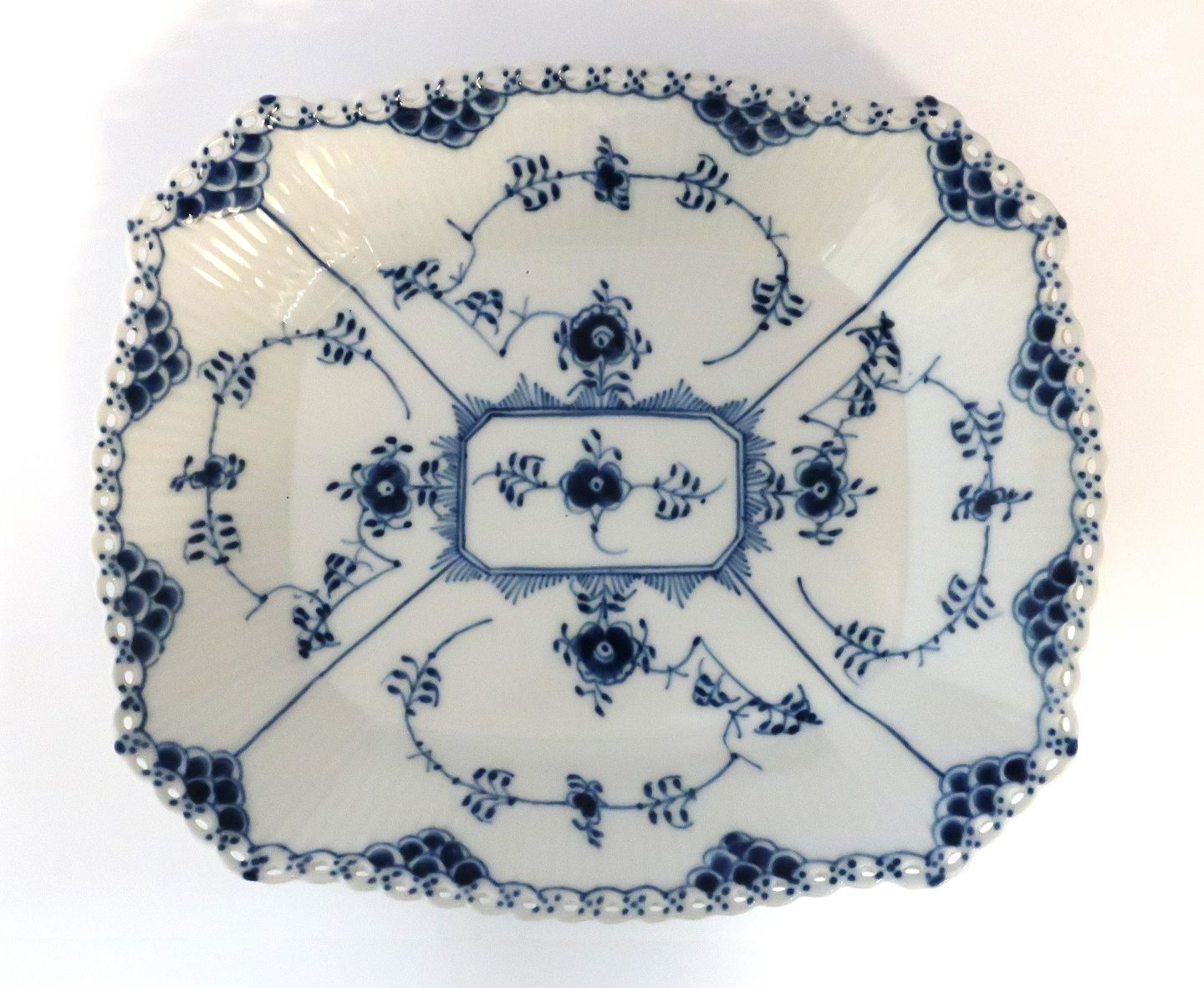 Royal Copenhagen. Musselmalet, Vollspitze. Quadratische Schale. Modell 1143. Länge 26 cm. Breite 23 cm. (3 Wahl).