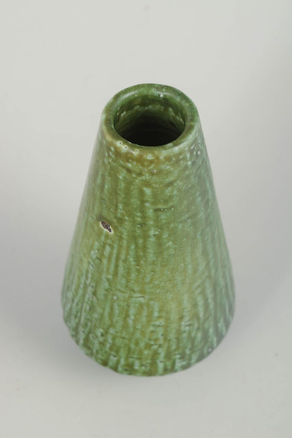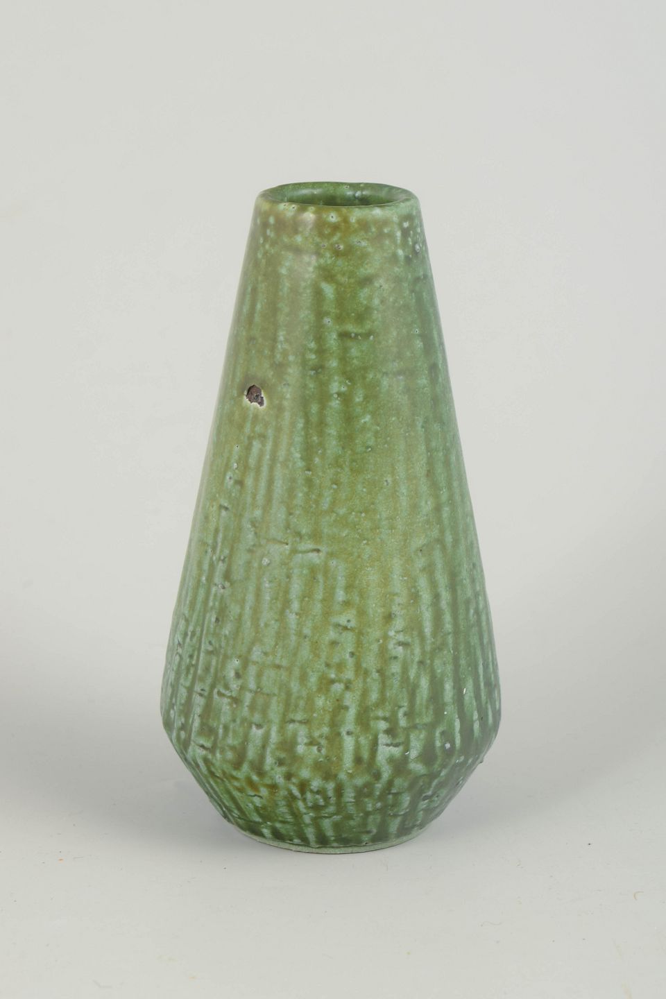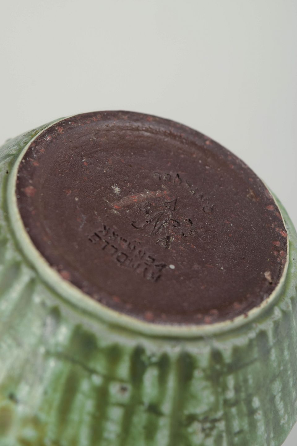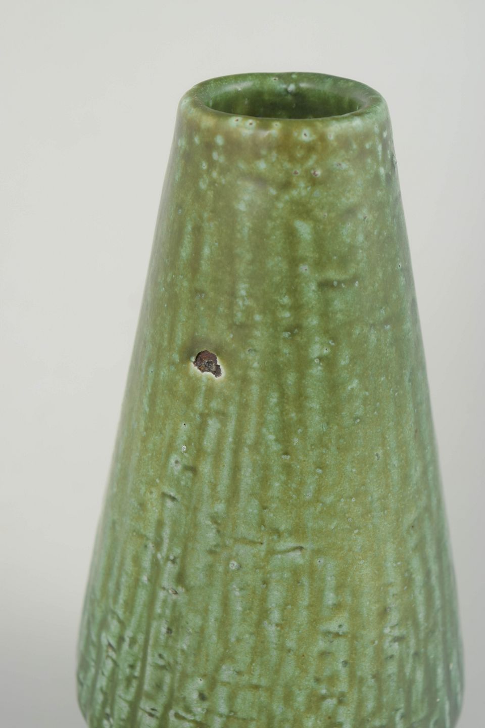 Organisk formet vase i stentøj med karakteristisk grøn, løbende glasur i Nymølle-udtryk. Overfladen har en vertikal, let rillet struktur, som fremhæver glasurens dybde og bevægelse. Mindre glasurfejl fra produktionen.