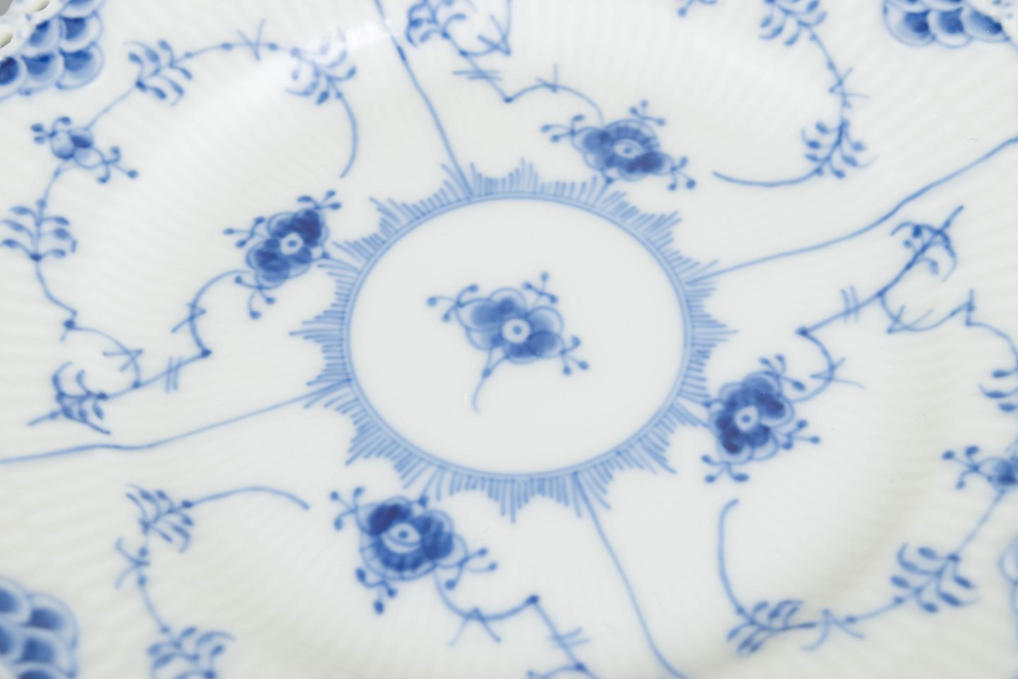 Tallerkener i Musselmalet helblonde med gennembrudt blondekant og håndmalet koboltblå dekoration. Udført i klassiske riflede former og velegnet som frokost- eller desserttallerkener.