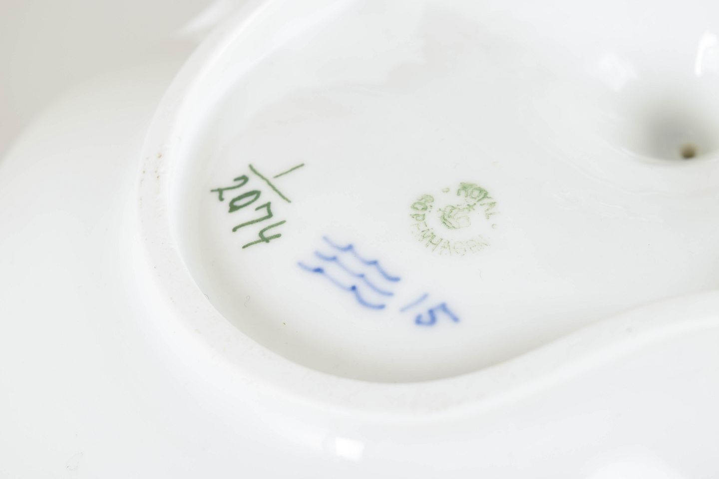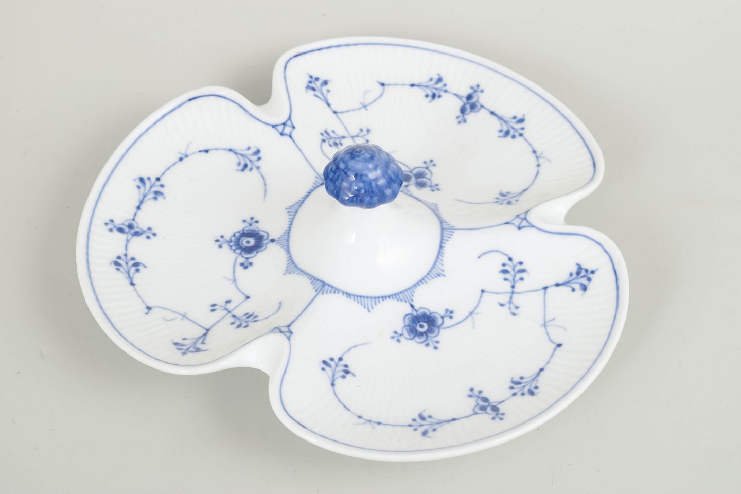 Sjældent cabaretfad i Musselmalet riflet, udført i den klassiske riflede form uden blondekant og dekoreret med håndmalet koboltblå underglasur. Fadet er opdelt i tre serveringsfelter med central knop, velegnet til små serveringer, snacks eller konfekt. En usædvanlig og dekorativ model fra mellemkrigstiden.