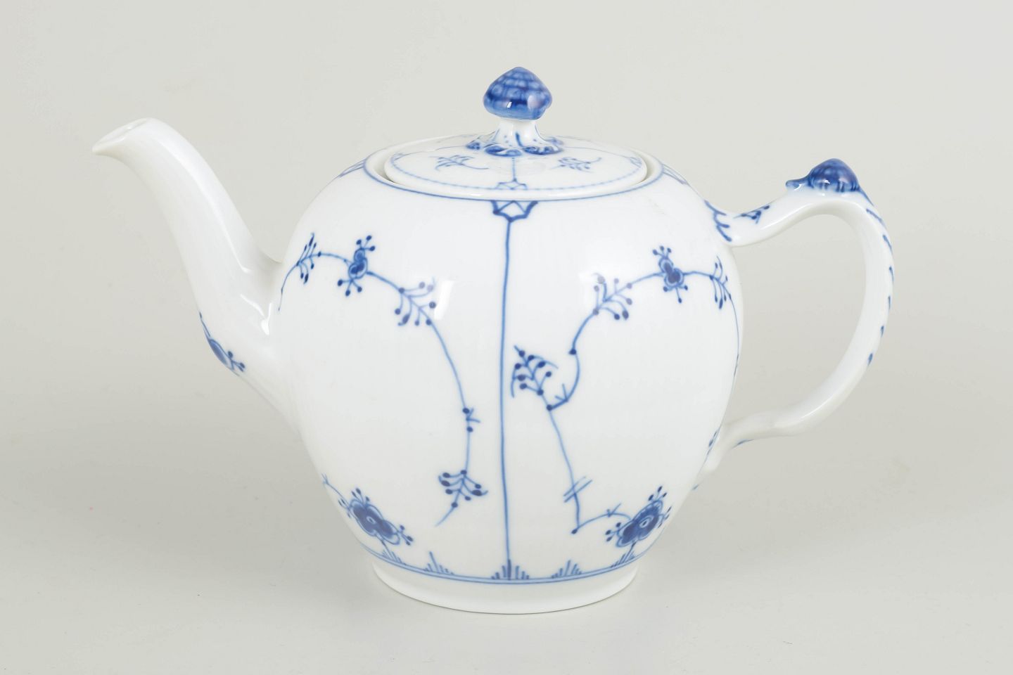 Klassisk tekande i Musselmalet, riflet, udført i den traditionelle riflede form uden blondekant og dekoreret med håndmalet koboltblå underglasur. Den harmoniske og velafbalancerede form med elegant tud samt låg med knop gør kanden velegnet til både daglig brug og samling.