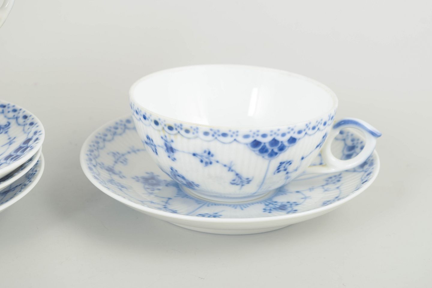 Sæt bestående af 4 tekopper med tilhørende underkopper i Musselmalet halvblonde. Klassiske riflede former med blondekant og håndmalet koboltblå dekoration.