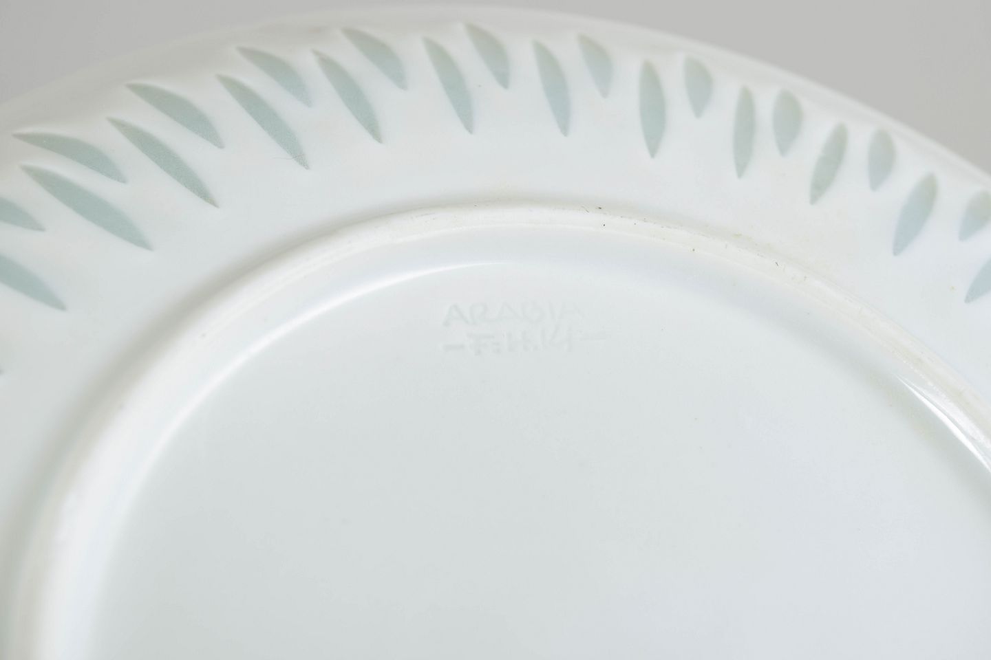 Sæt bestående af seks tallerkener i hvidt porcelæn dekoreret med karakteristisk “rice porcelain”-ornamentik langs fanen. De aflange, transparente glasurfelter danner en let og rytmisk bort, som giver tallerkenerne et elegant og luftigt udtryk. Det enkle formsprog er typisk for Friedl Holzer-Kjellbergs sene porcelænsdesign for Arabia.