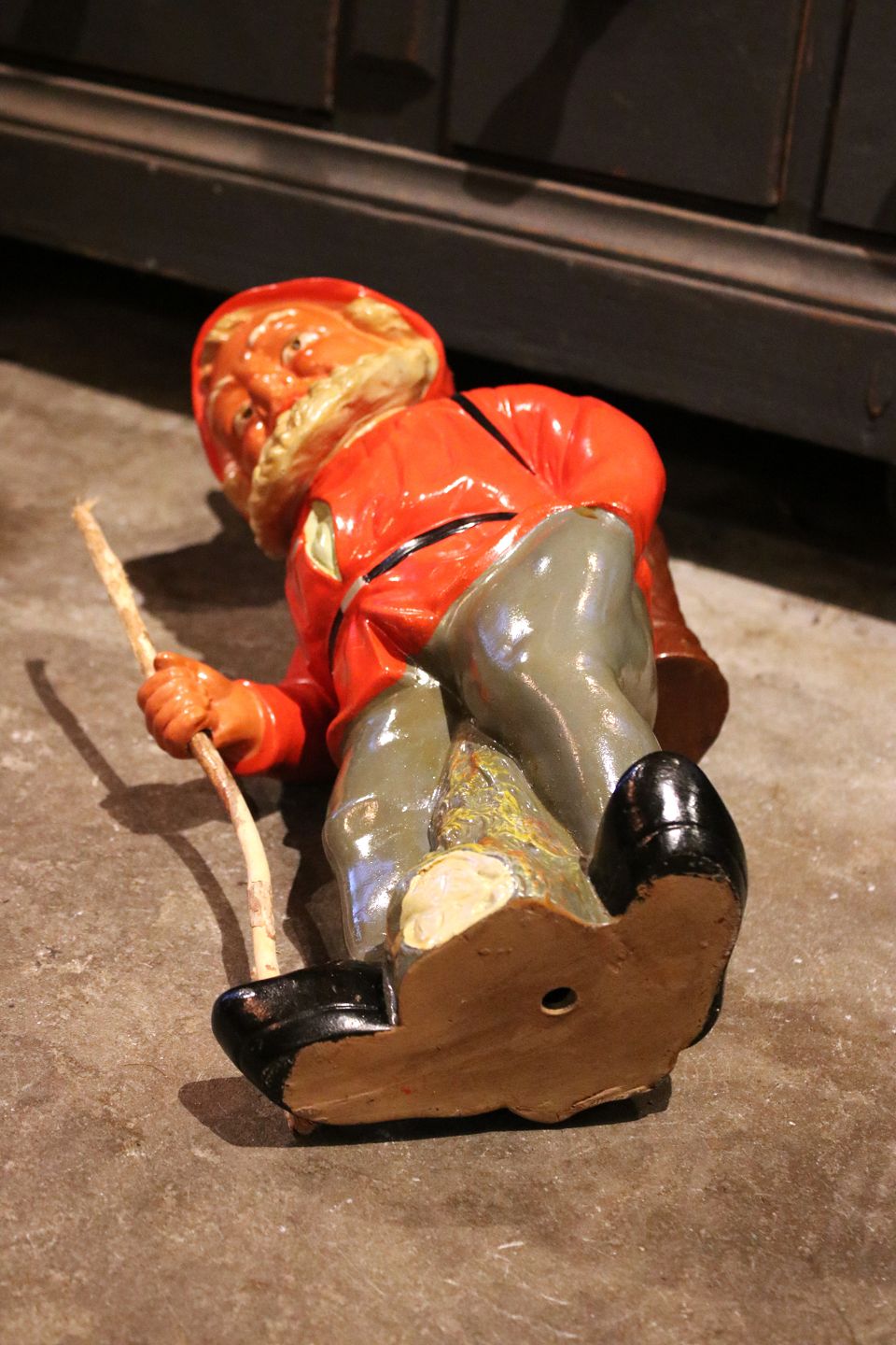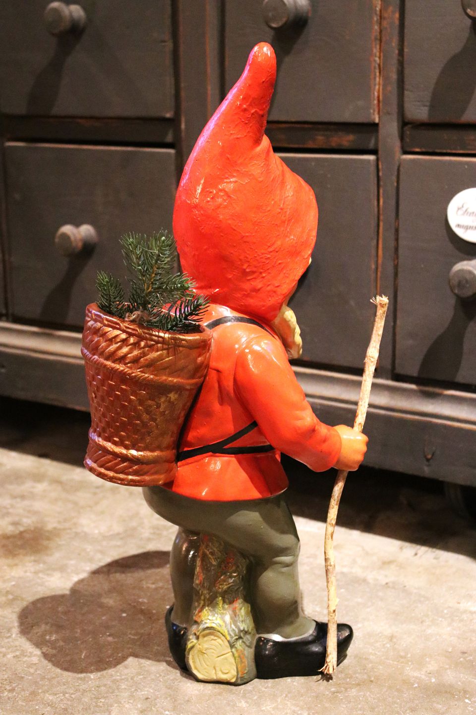 Stor terrakotta nisse fra 50érne med fin bemaling , rygsæk og stok i træ.