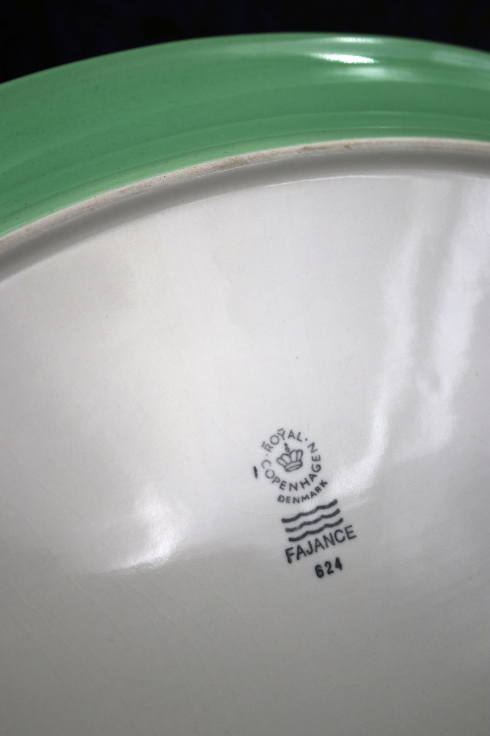Gammelt oval Ursula fajance serverings fad / tallerken fra Royal Copenhagen designet af Ursula Munch-Petersen med grøn glasur.
