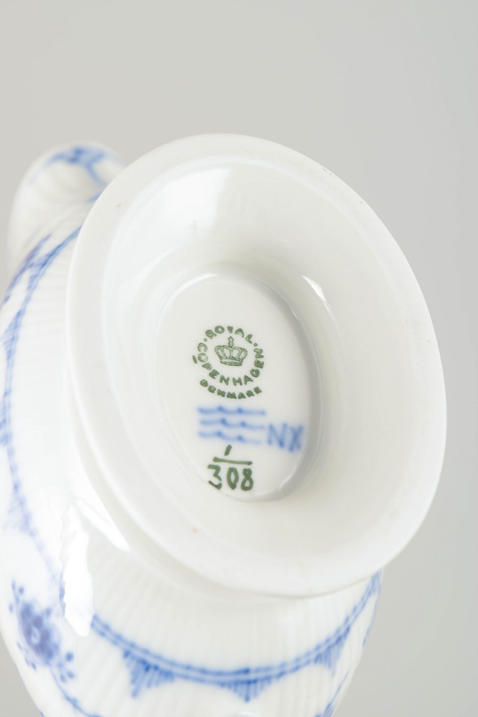 Text zugänglich auf Dänische: Royal Copenhagen Musselmalet Riflet lille saucekande, 1963.