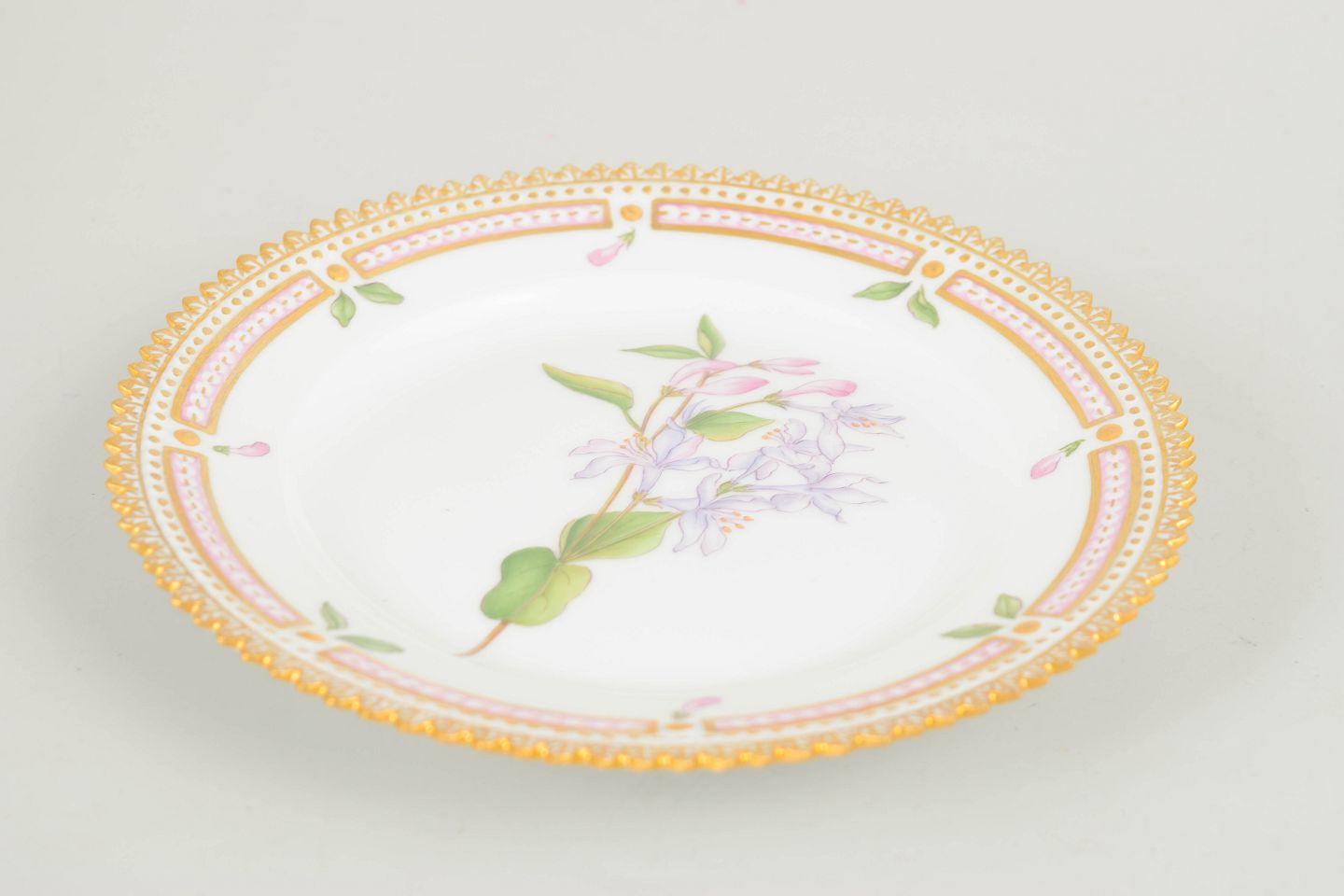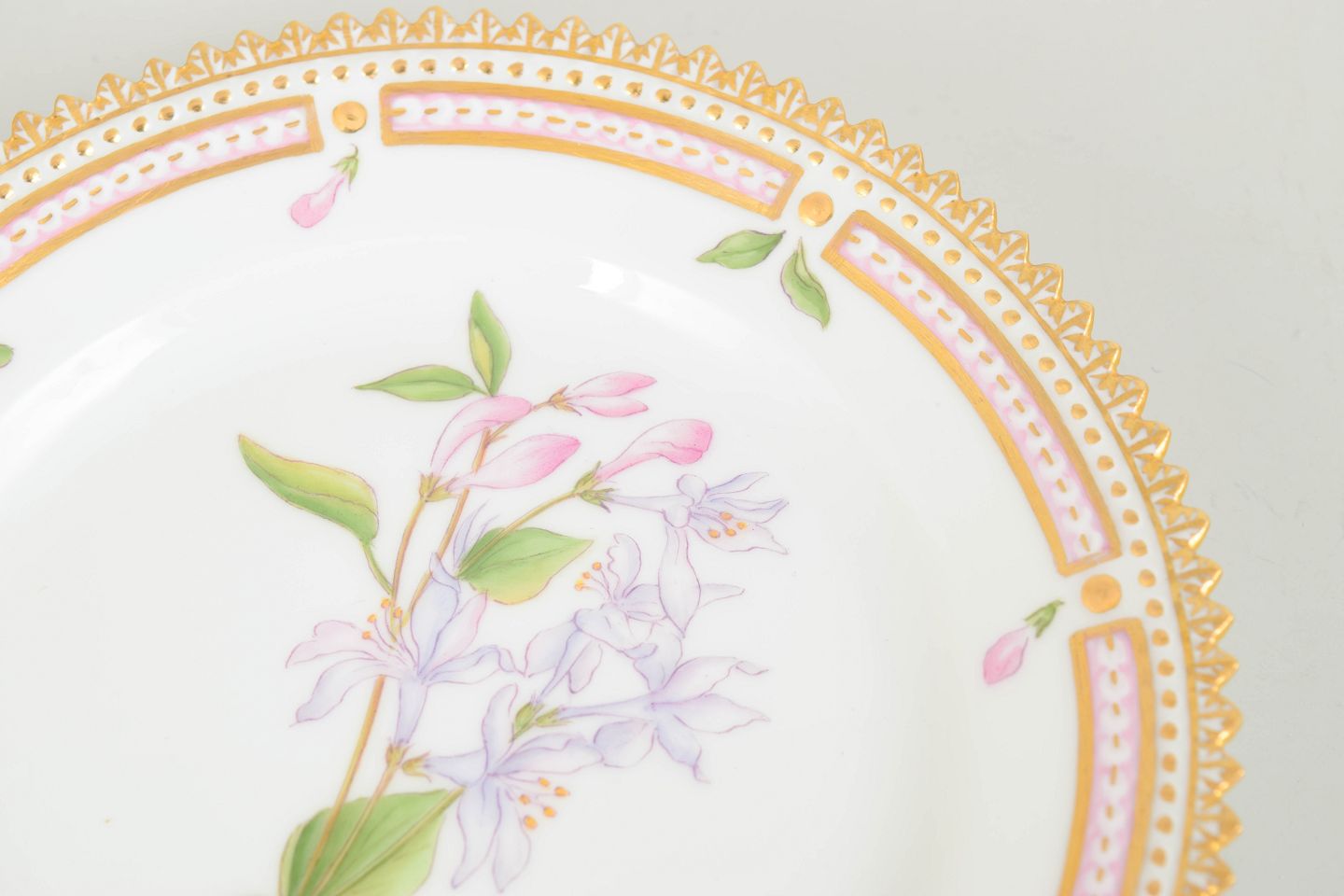 Elegant sidetallerken i det ikoniske Flora Danica-stel, håndmalet med botanisk motiv gengivet efter Flora Danica-værket. Tallerkenen er udført med den karakteristiske form og forfinede kant, som kendetegner stellets eksklusive og klassiske udtryk.