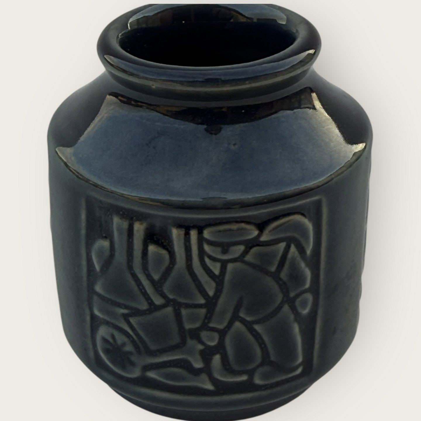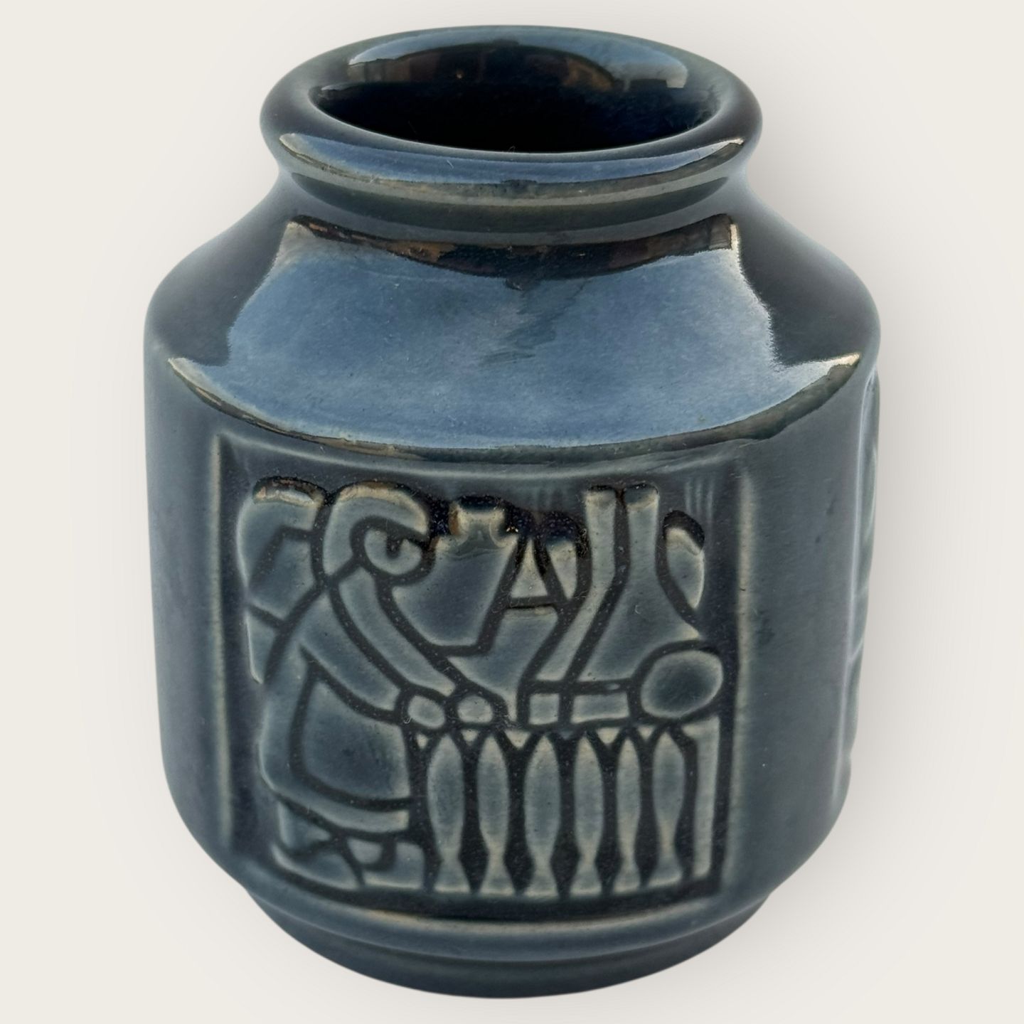 Bornholmer Keramik, Michael Andersen, Kleine Vase mit Motiven aus Bornholm, Räuchereien, Fischerfrauen usw. Höhe 8 cm, Durchmesser 6,5 cm, Nr. 6123, guter Zustand.