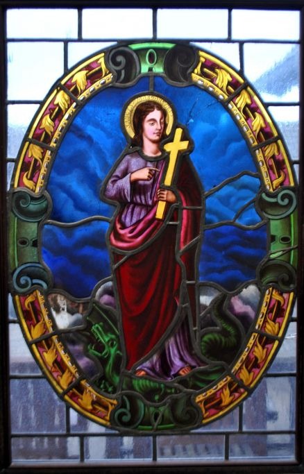 Katholisches Kirchenmosaik, Buntglas, 19. Jahrhundert. Motiv: Santa Margherita. Die stehende Margherita trägt ein Kreuz, zu ihren Füßen liegt ein Drache. Gerahmt in einem Eisenrahmen mit Aufhängung. 96,5 x 64 cm.