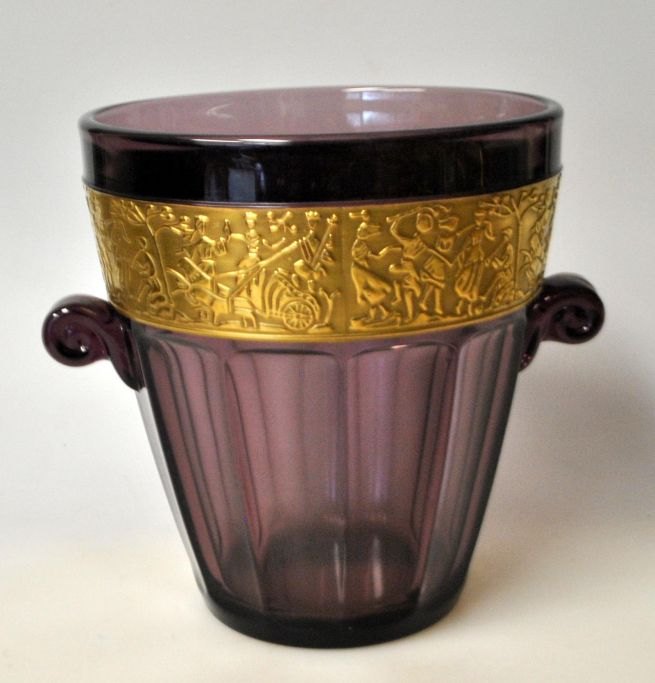 Moser, Ludvig & Söhne, Karlsbad, 1920er Jahre: Ein Paar Eisbehälter. Violettes Glas mit geätztem Goldfries und dem Motiv „Krieger“. Höhe: 14 cm.