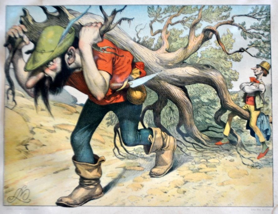 Moe, Louis (1877–1945) Dänemark: Komposition mit Mann, der einen Baum trägt. Farblithografie. Signiert im Druck. Herausgegeben von Alfred Jacobsen, Kopenhagen. 27,5 × 36 cm.