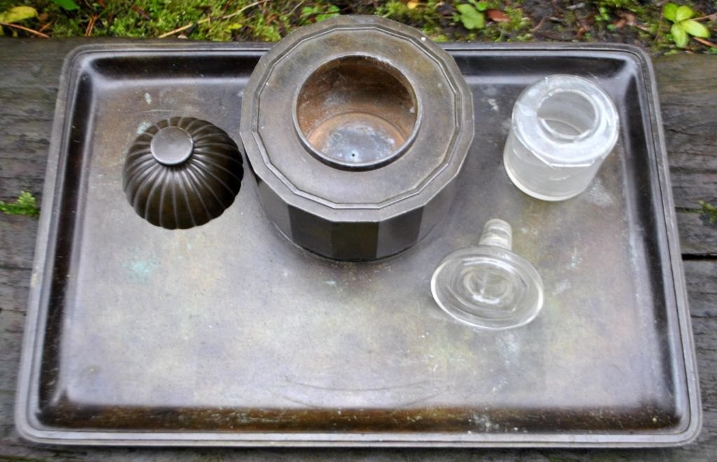 Teller mit Tintenfass im Art-déco-Stil. Im Tintenfass befindet sich ein Tintenfass mit Deckel (defekt).