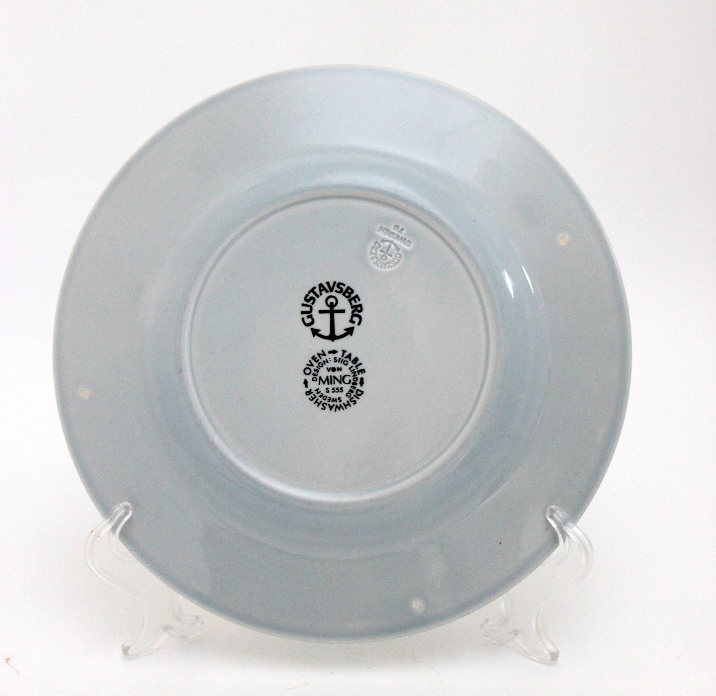 Text zugänglich auf Dänische: Gustavsberg, Sverige, Ming, Frokosttallerken. Designet af Stig Lindberg i 1979. Lyseblå glasur med mørkeblåt motiv. Mærke: "Gustavsberg Sverige. Design Stig Lindberg, Stentøj MING, VDN S555. Ovn, bord, opvaskemaskine". God stand. Diameter 19,5 cm. Pris: 125 kr. stk. Lager: 6
